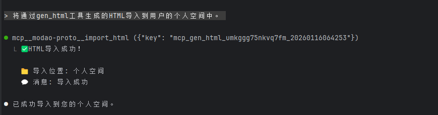 node D:\VScodeProjects\modao-proto-mcp\bin\cli.js --token <YOUR_TOKEN>- 若命令成功运行并没有报错,则准备工作完成。