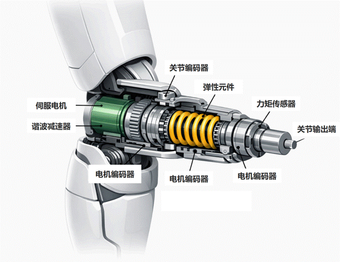 柔性驱动(串联弹性执行器,SEA)是一种"刚性动力单元+柔性弹性元件"的混合驱动方案,核心逻辑是在电机-减速器与关节执行端之间串联弹性元件(如螺旋弹簧、聚氨酯弹性体、波纹管),通过弹性元件的形变实现"冲击缓冲、精准力控、人机安全交互",适配人形机器人与人机接触频繁、需缓冲冲击的关节(如腕部、肘部、踝部),是平衡"安全性-力控精度-动态适配性"的关键技术路径。
