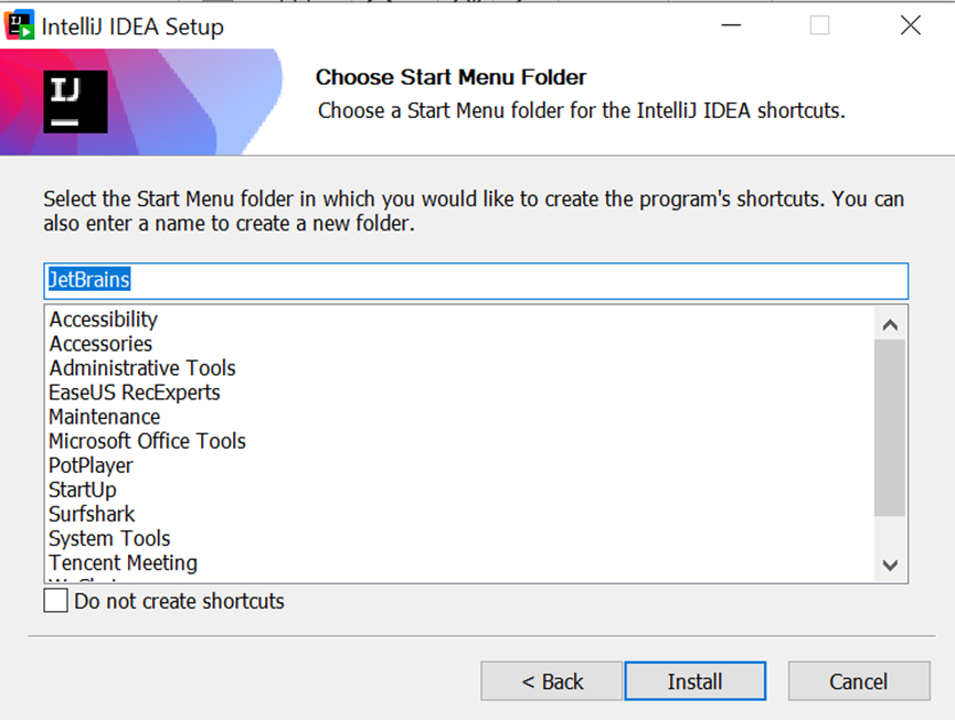 选择启动菜单文件夹,按照默认名称JetBrains,点击Install开始安装。