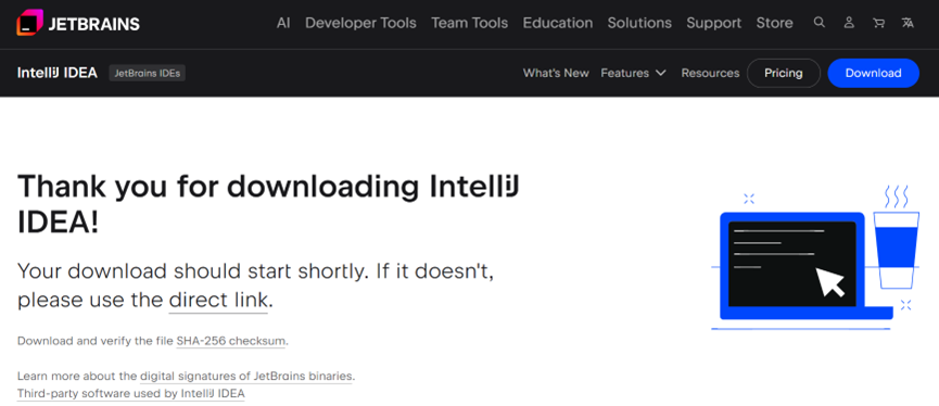 此时出现Tank you for downloading IntelliJ IDEA!的感谢画面,说明已开始下载;如果尚未下载,则可点击页面中带有下划线的链接文字direct link来直接下载。