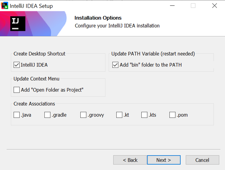 在"Installation Options"(安装选项)对话框中,将必选的创建IntelliJ IDEA桌面快捷方式,以及更新PATH变量,即复选"Add "bin" folder to the PATH"增加安装路径到环境变量PATH。