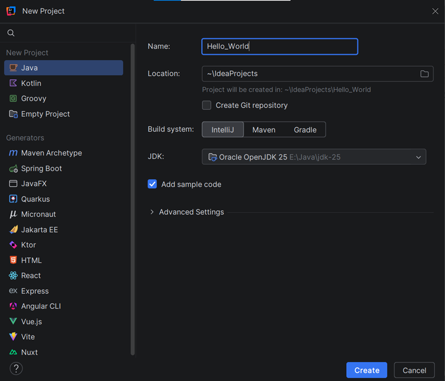 命名新项目后,按照默认JDK版本(即Oracle OpenJDK 25),点击Create创建项目。