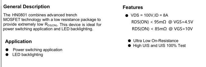 HN0801 是100V 8A N 沟道增强型 MOSFET,主打中压大电流、低导通电阻,采用 SOT-89 贴片封装,广泛用于消费电子与电源切换场景。
