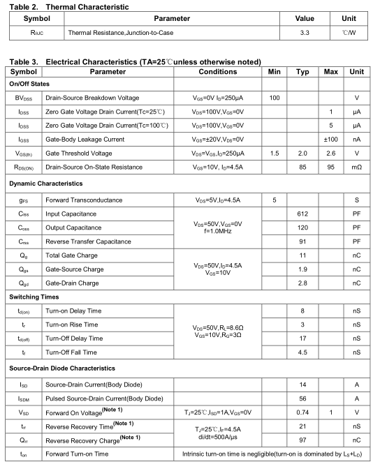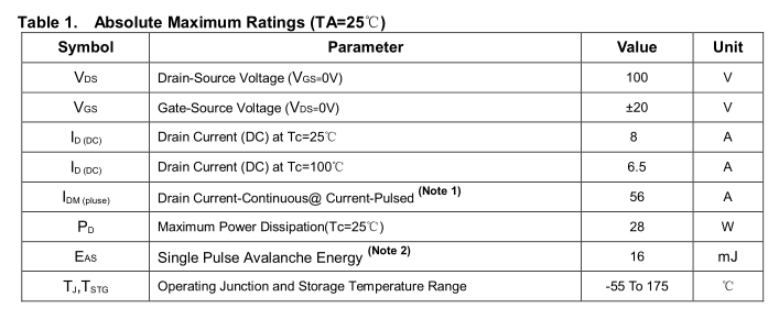 | VDS(漏源击穿电压) | 100V | 额定耐压 |