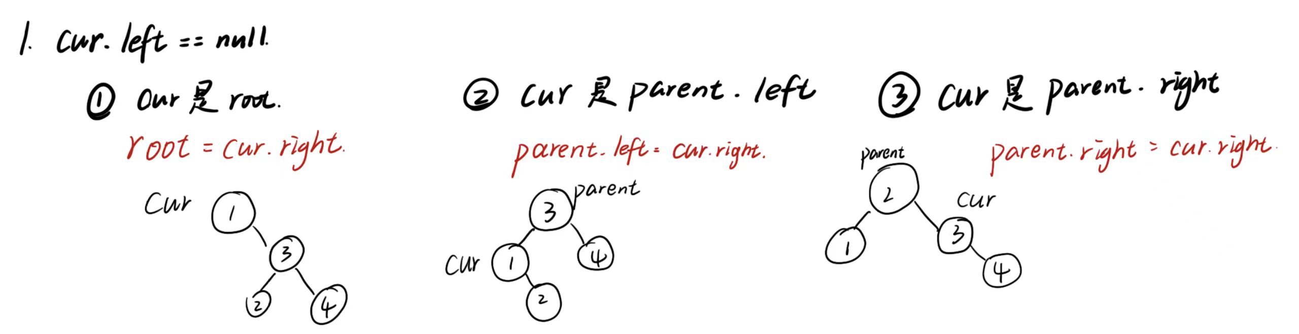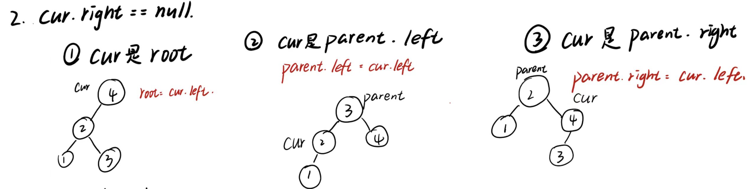 若cur是根节点,根节点更新为cur的右子树;否则,将父节点(parent)的对应指针(左/右)指向cur的右子树。