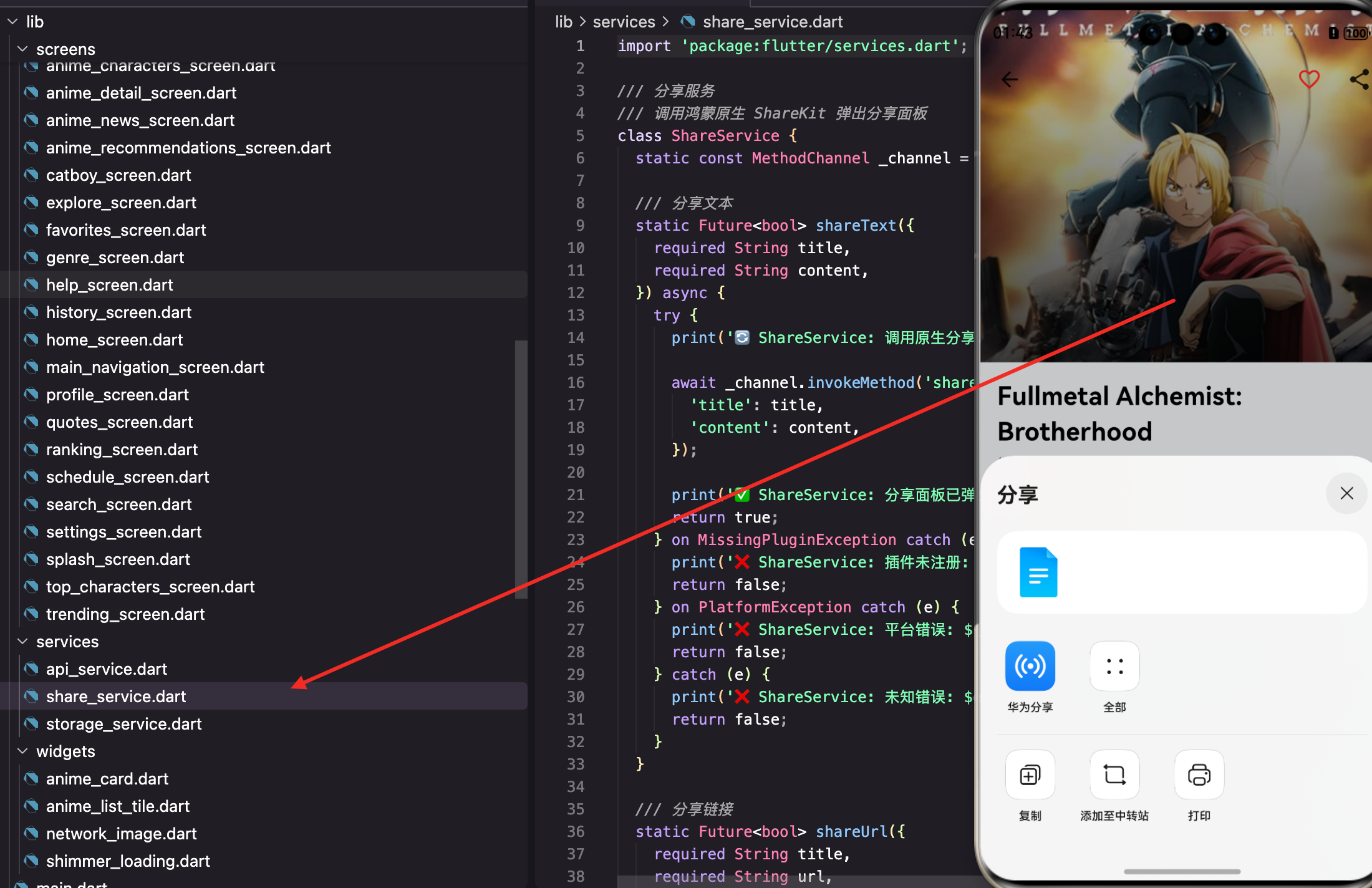 分享是社交传播的重要途径,用户看到喜欢的动漫想分享给朋友。在 HarmonyOS 上,分享需要调用原生的 ShareKit,Flutter 通过 MethodChannel 与原生代码通信。