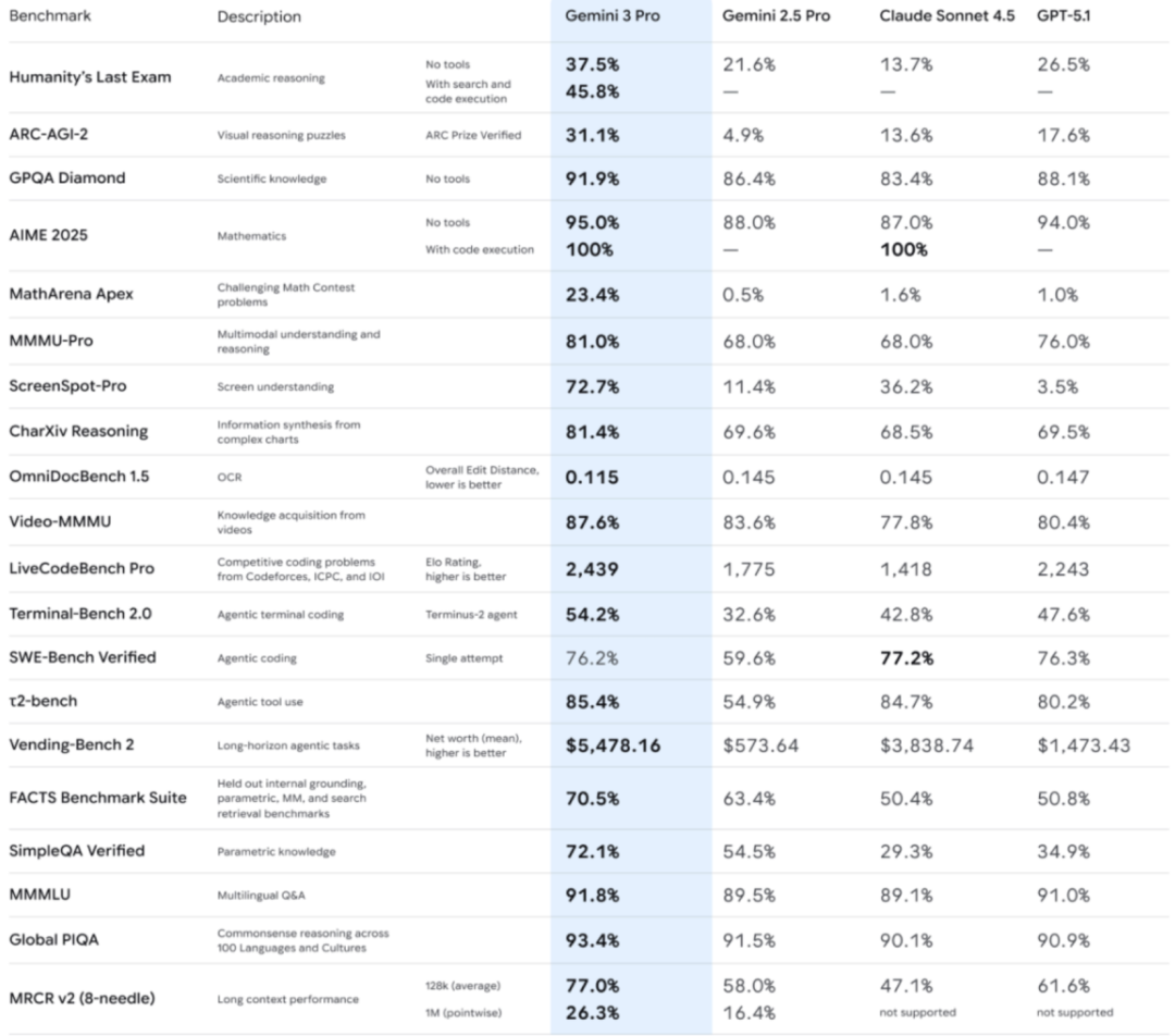 但Gemini 3 Pro的出现,彻底打破了这种胶着的局面,它不是小步快跑,而是直接断层领先,把整个AI的格局都给改写了。