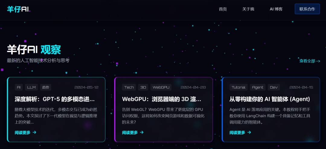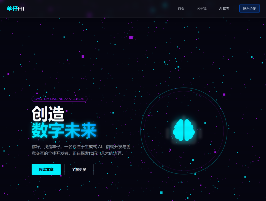 设计并创建一个极具未来感的个人作品集网站,包含3D交互式背景、粒子动画背景、响应式布局,以及一个能展示羊仔AI文章的动态博客模块。要求所有代码都集成在一个HTML文件里,并能直接在Chrome浏览器中运行。