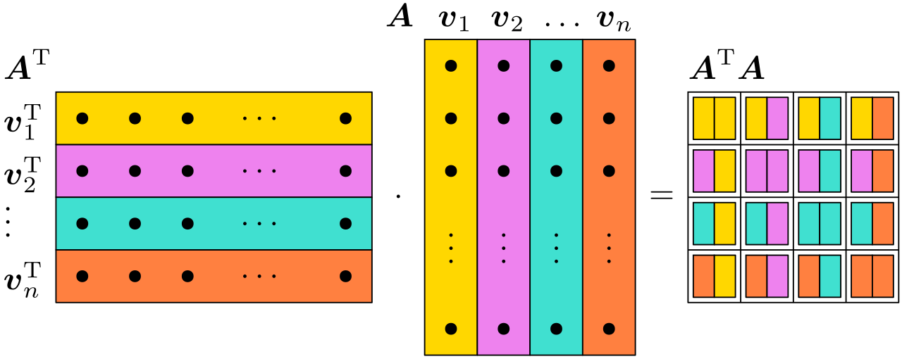 "第一行"在图里就是:最上面那条(黄色那条)行向量 ,去和中间矩阵 A 的每一列 依次"点乘",得到右侧 Gram 矩阵的第一行。