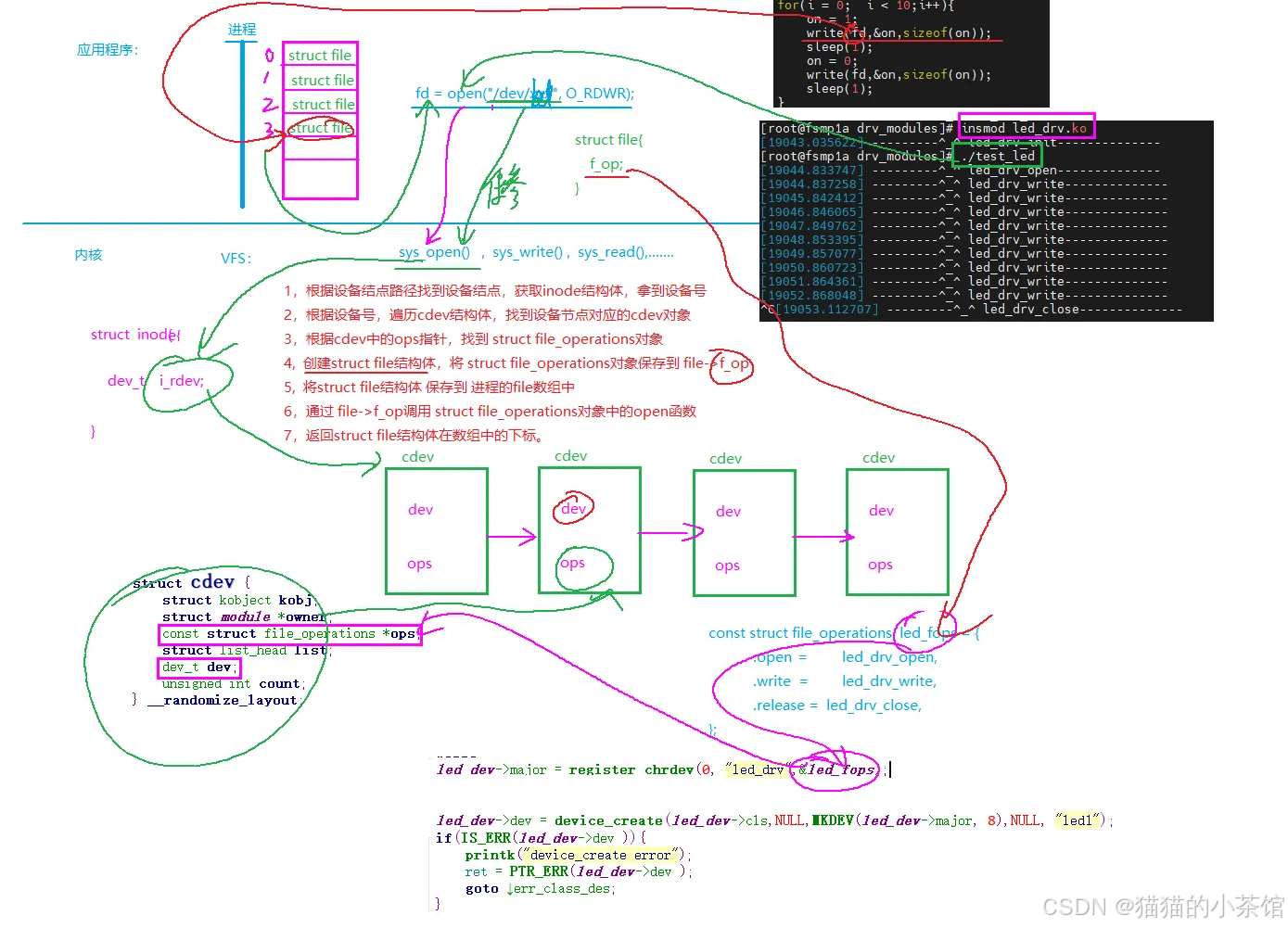 kzalloc初始化设备对象 → 注册miscdevice→ 硬件映射 →open/read/write/ioctl操作 → 模块卸载时释放资源。核心关键步骤:VFS 结构体之间的关系、面向对象封装、寄存器读写、ioctl 编码、错误处理。