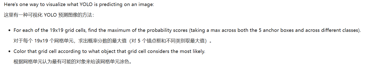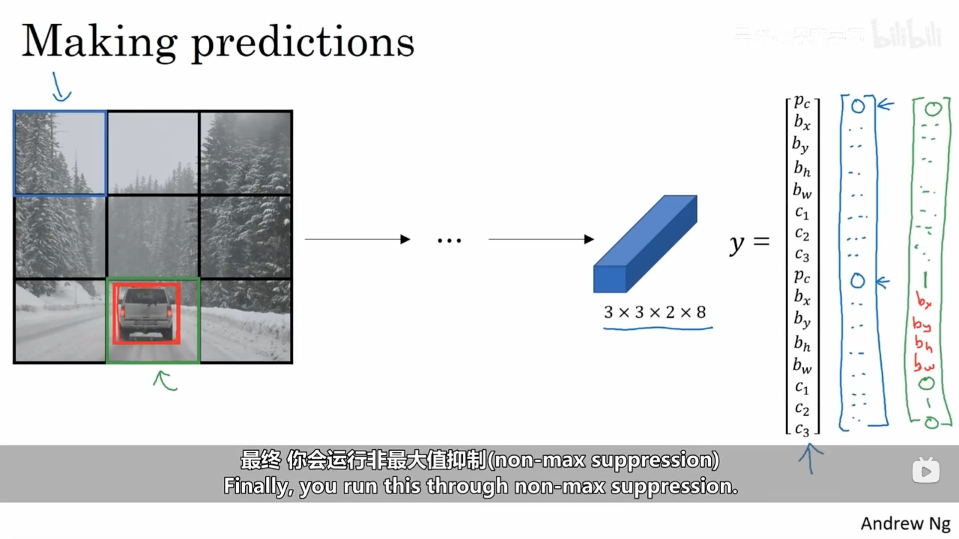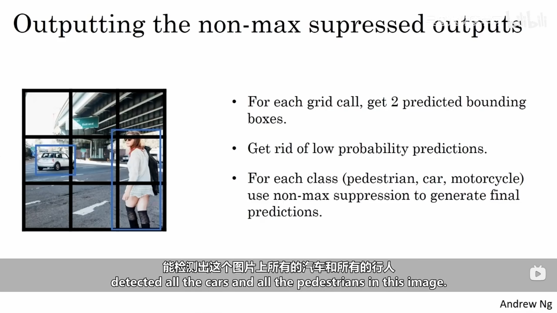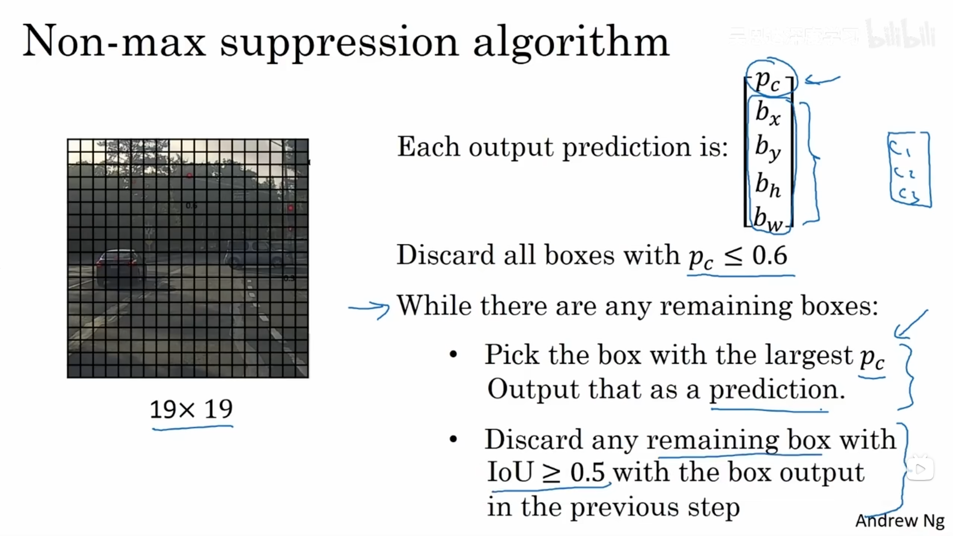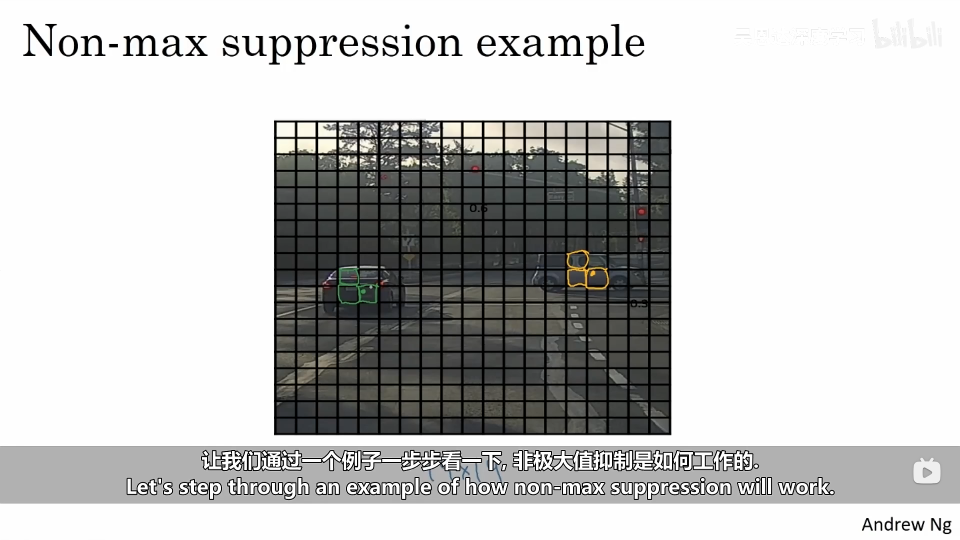 图像被划分为了多个网格,从技术上来说,中心点只会将目标划分到其中一个网格中去,然而在对网格进行目标定位时,其中有多个网格都会被识别为车,接下来我们看非最大值抑制是如何做的。它首先会看每一个检测结果的相关概率,它会取其中的最大值,剩下的方框以及所有和你刚输入的那个结果有着多重叠的、有着高IoU值得方形区域将会被抑制,也就是其他概率得方框将会被调暗。