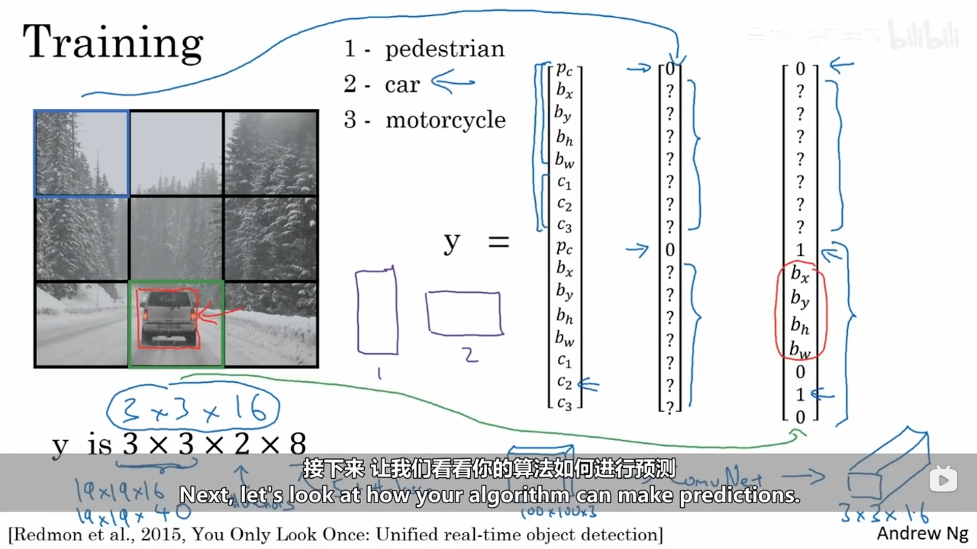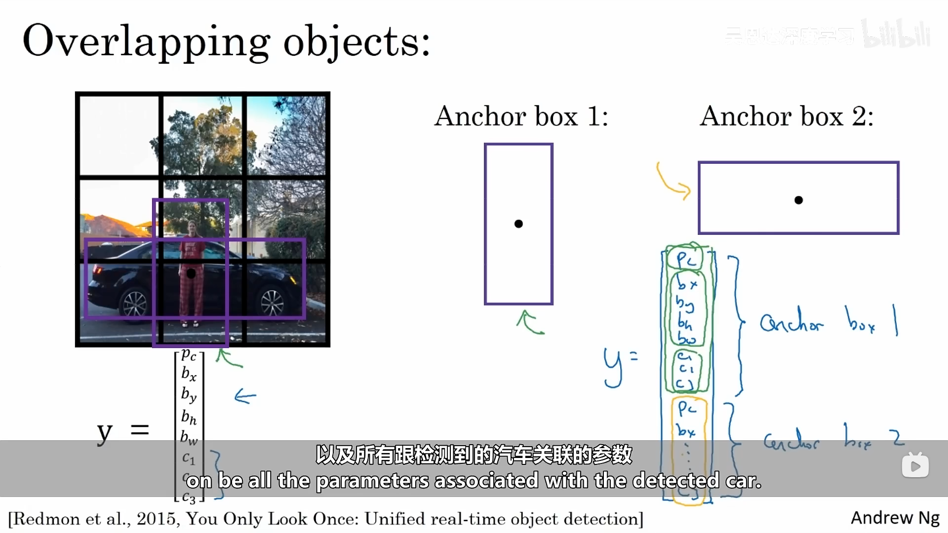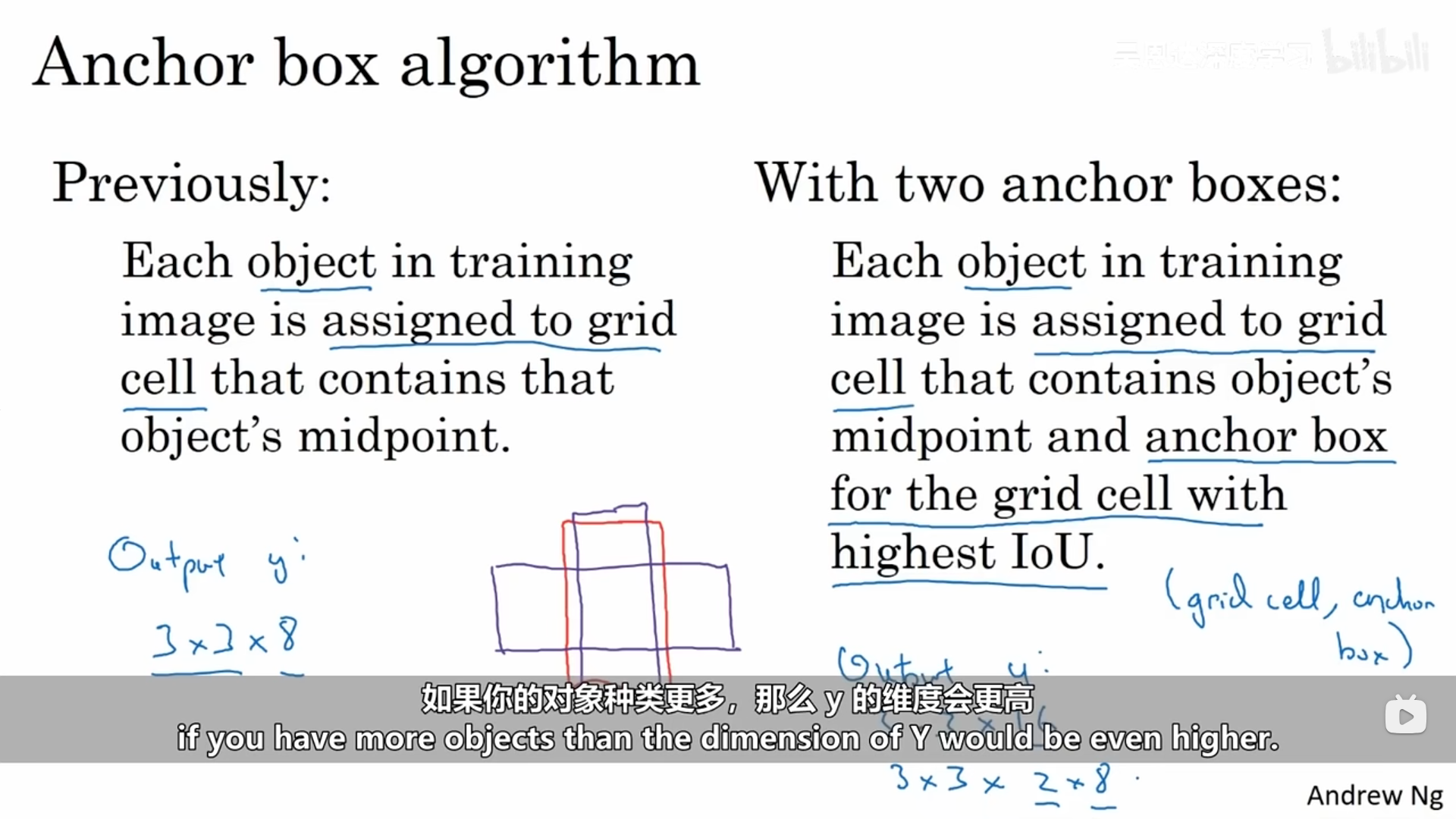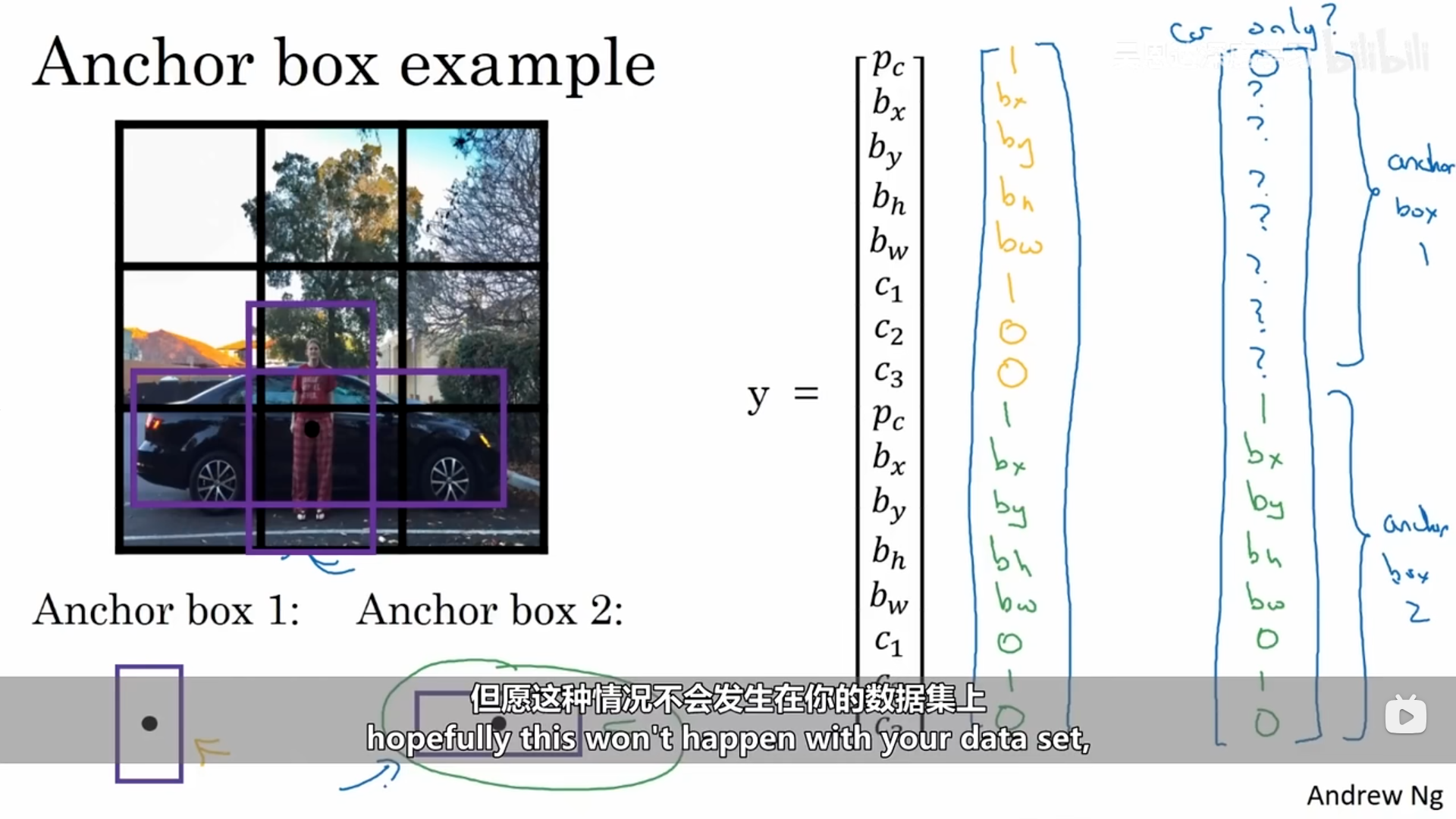 目前我们讲过的目标检测中每个单元格只能检测一个对象,我们可以使用锚框来使得一个单元格可以检测多个对象。这里我们可以更改输出:当某一个网格中存在多个对象时,我们可以预先定义两个不同的形状,称作锚框,接下来我们需要将两个预测跟两个锚框关联起来。接下来定义交叉标签。