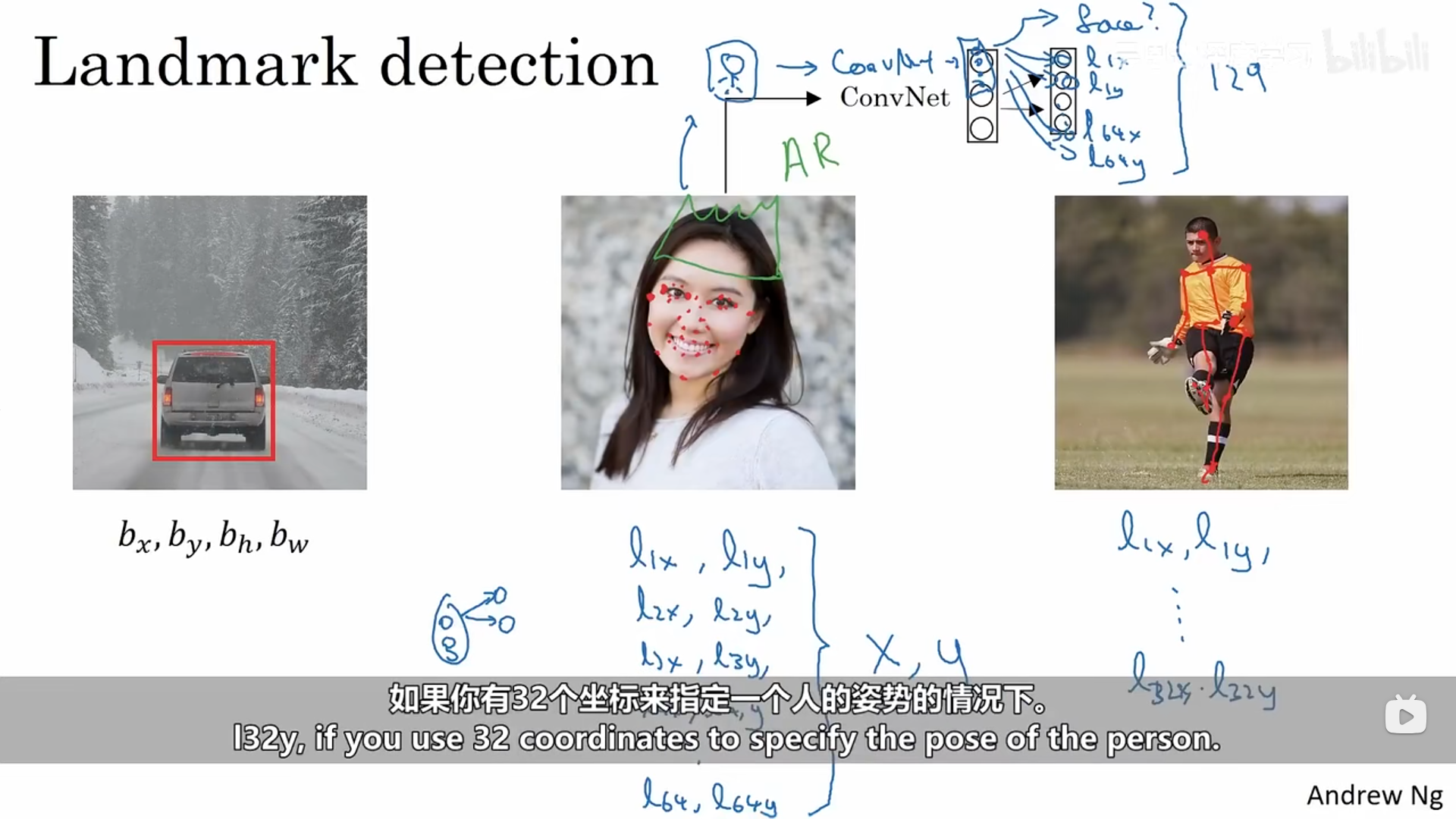 我们上述说到的目标定位是需要输出一个具体的定位边界框,而地标检测只需要输出重要的点和图像的(X,Y)坐标。比如说我现在需要识别图像中人的眼角的位置,这时候我们可以建立一个神经网络模型,它的输出层只输出两个数字,当然我们也可以修改神经网络,让它学习多个特征,输出人脸部的所有重要的关键特征的坐标。同样这种方式也适用于人体姿态检测。