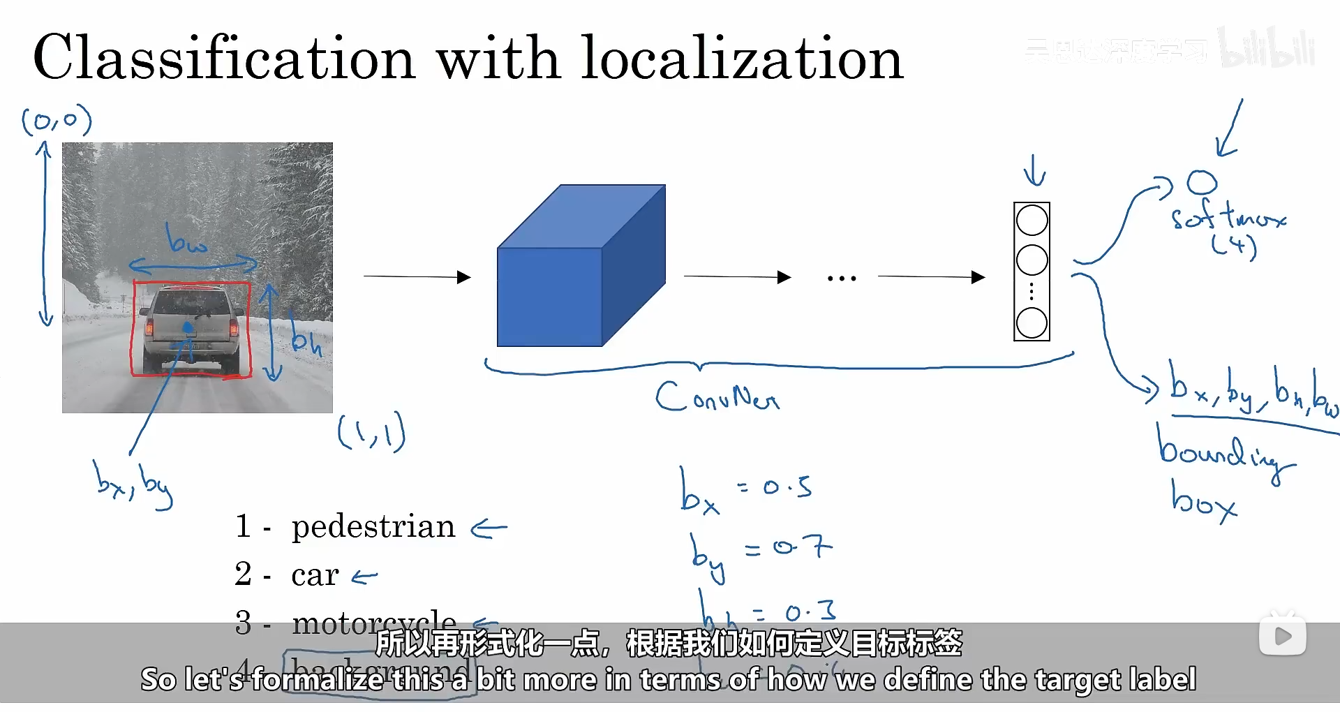 在进行定位时,我们网络最终除了要输出分类之外,还需要输出标签的位置信息(边界框:bx,by,bw,bh)。如下图所示。