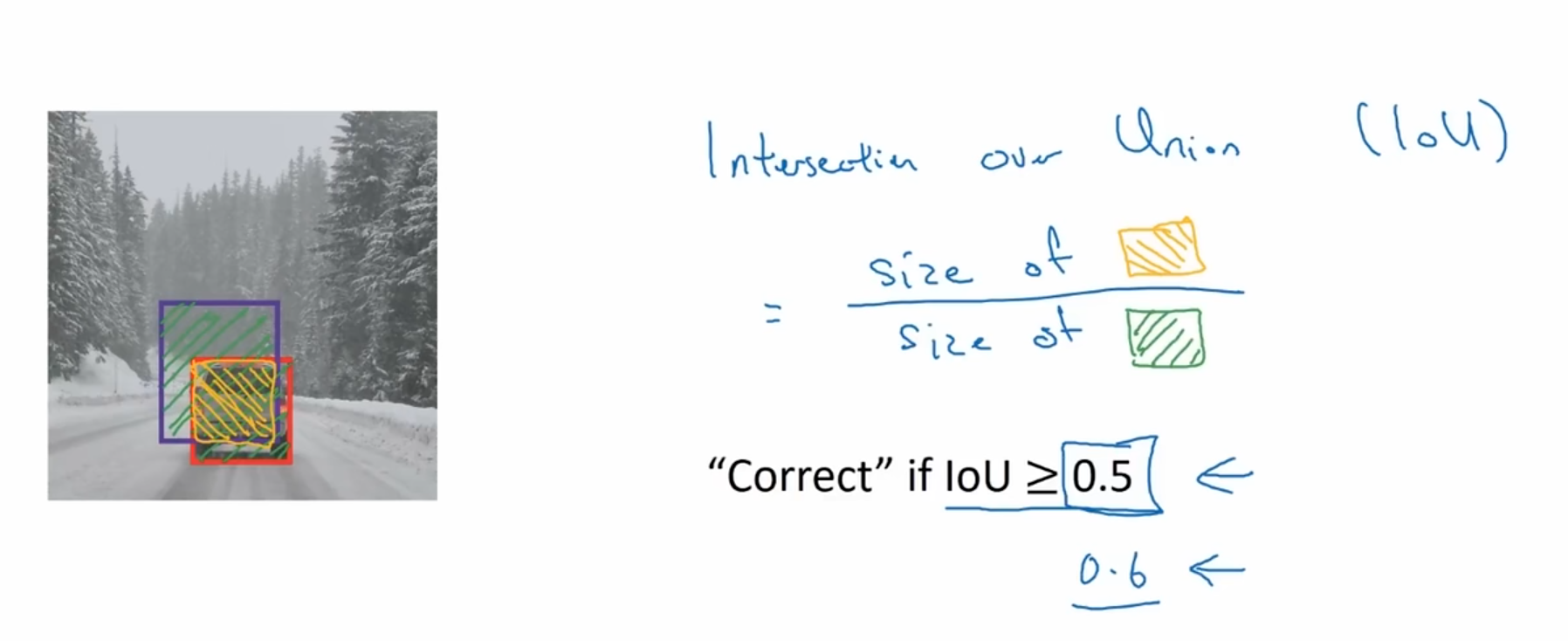 交并比函数(IoU):计算的就是我们预测的边界框与实际的边界框的交集和并集的比值。即IoU是两个边界框重叠程度的一个度量值,当IoU大于0.5,结果就会被判定为正确。
