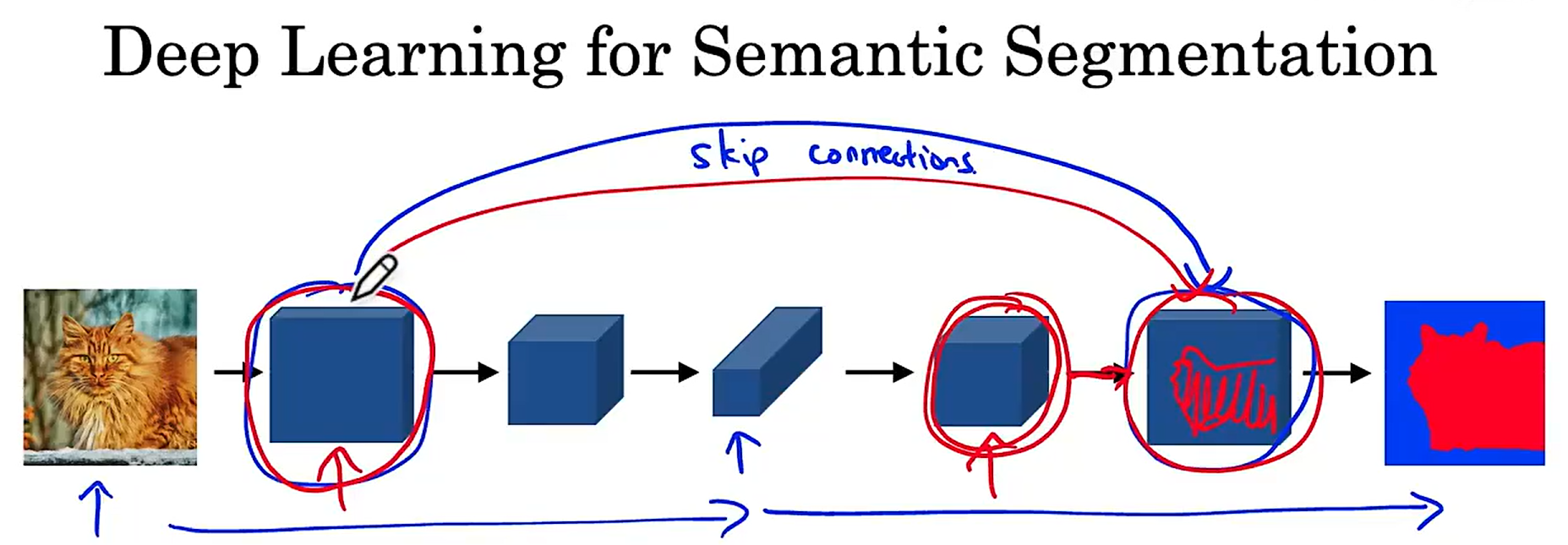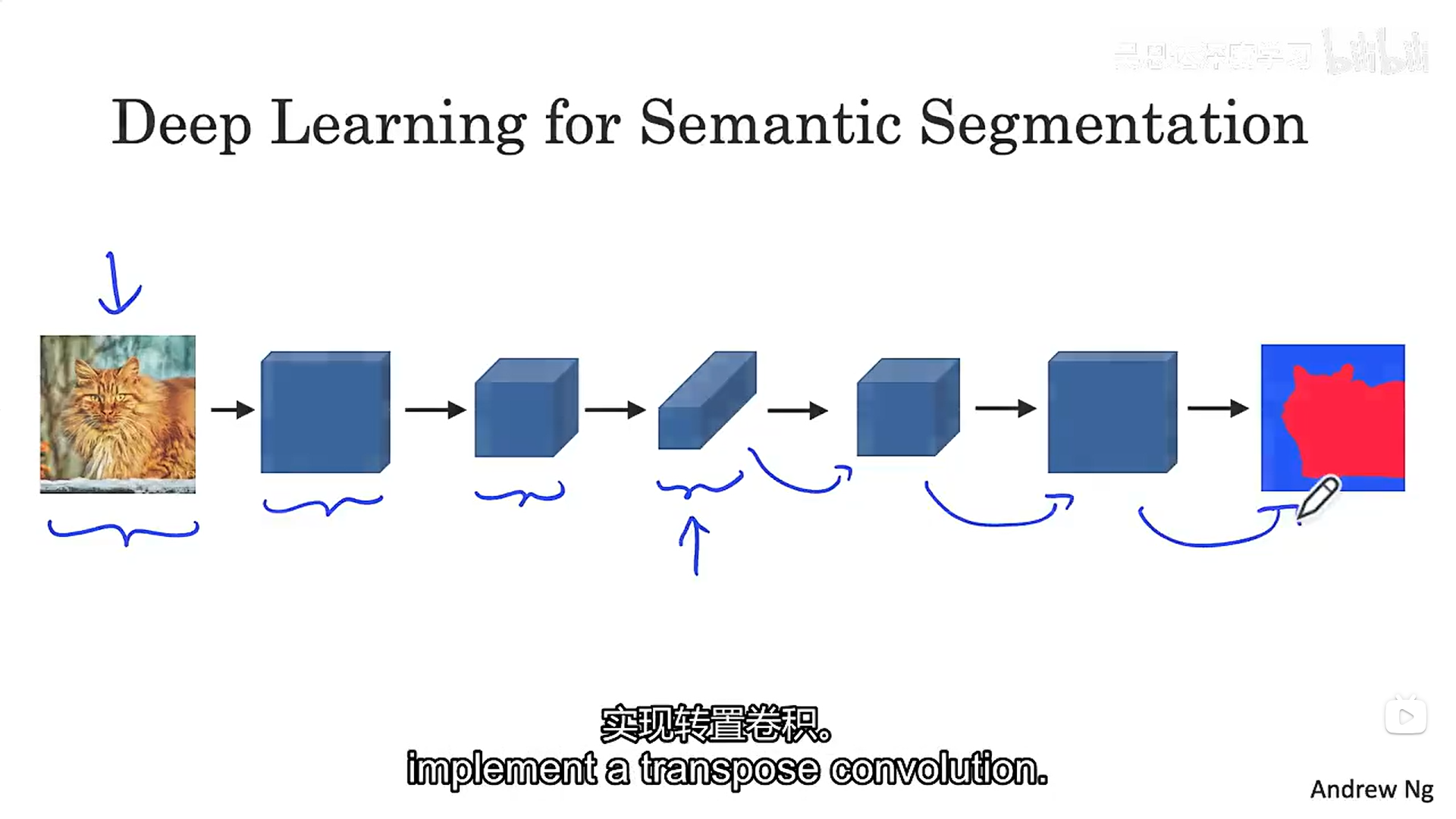 我们学过的对象检测,它会使得我们图像的尺寸变得越来越小,而图像分割是保留原尺寸大小的,意味着在对象检测流程中的某个部分我们就需要开始使用一些技术使我们图像的尺寸恢复到之前的大小(转置卷积),并且也要求能够对图像进行精准的分割。
