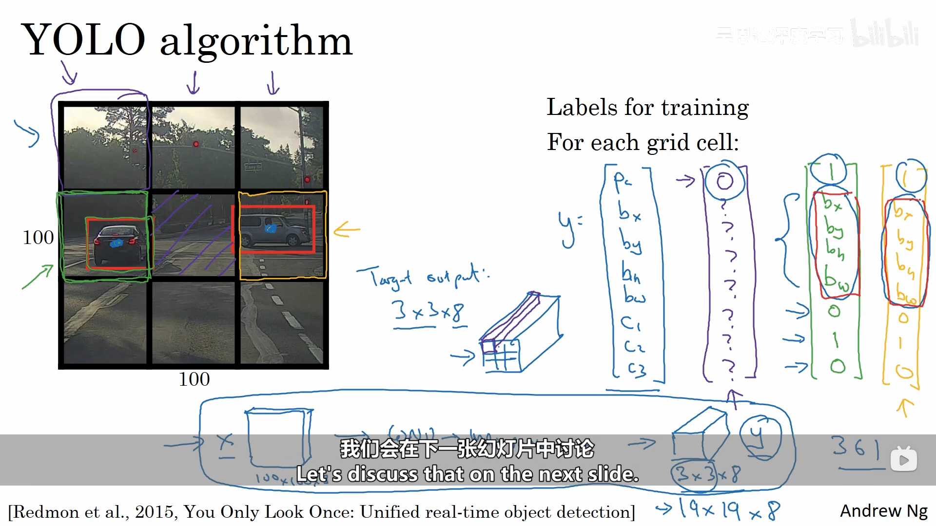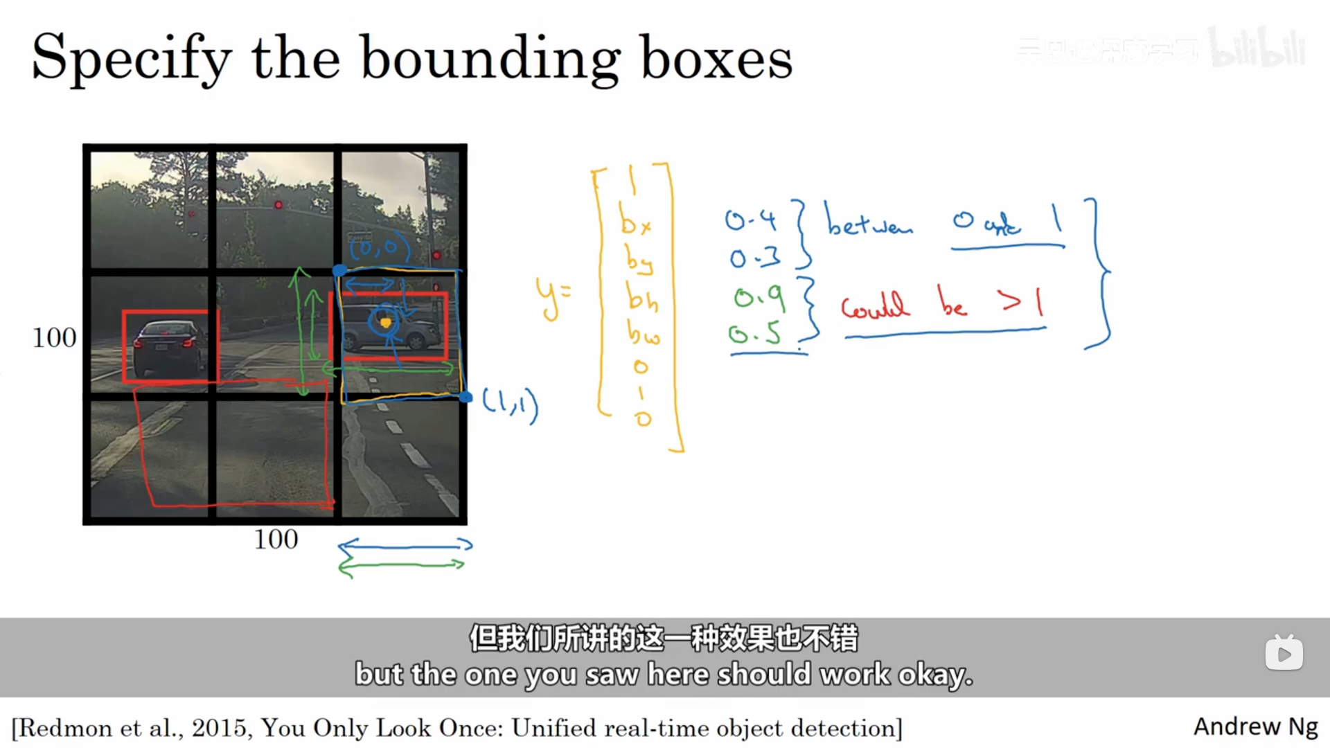 这个算法跟我们之前讲的基于卷积的滑动窗口目标检测算法非常类似,不同之处在于,图像在进行检测时,获得的目标的具体位置,会计算出一个中心的位置,再根据中心点的位置将它分配到包含该中心点的网格中,所以对于每一个目标物,即使它跨越了多个网格,它也只会被分配到众多网格中的一个当中去。