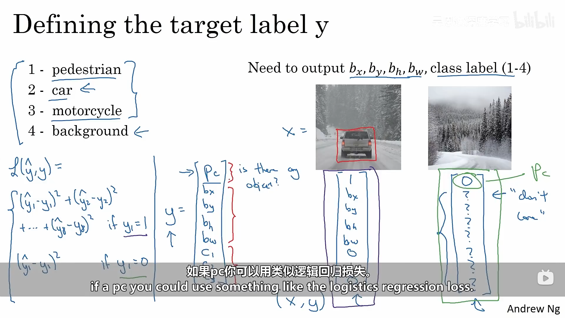 那我们如何定义目标值y呢,y里面包含了几个部分(Pc:是否包含某个对象、bx、by、bw、bh、0:不是第一个类别、1:属于某个类别...),目标值y定义完之后,我们的损失函数应该如何定义呢?下图中给出了当我们使用均方误差作为损失函数时分成了两种情况进行讨论:(Pc为1或者0)