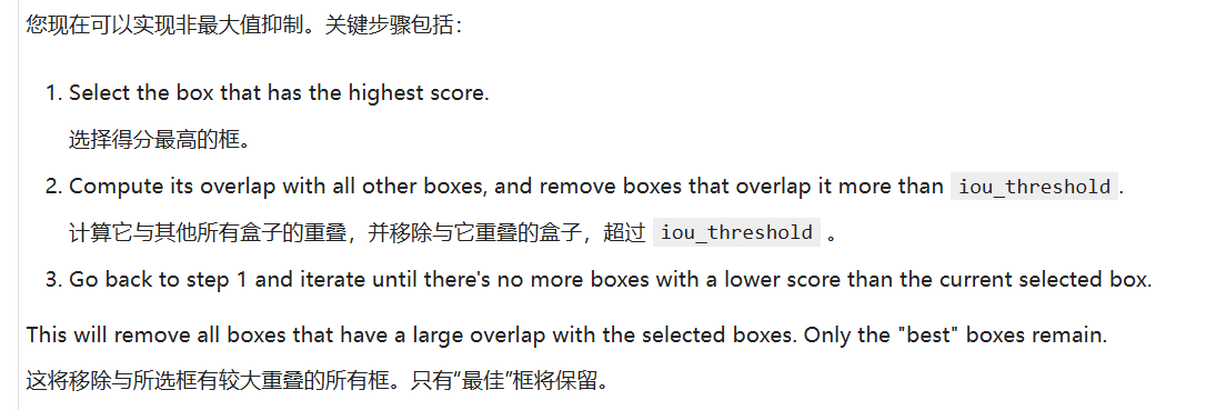 即使在对类别的得分进行阈值过滤后,仍然会得到很多重叠的框。用于选择正确框的第二个过滤器称为非最大抑制 (NMS)。