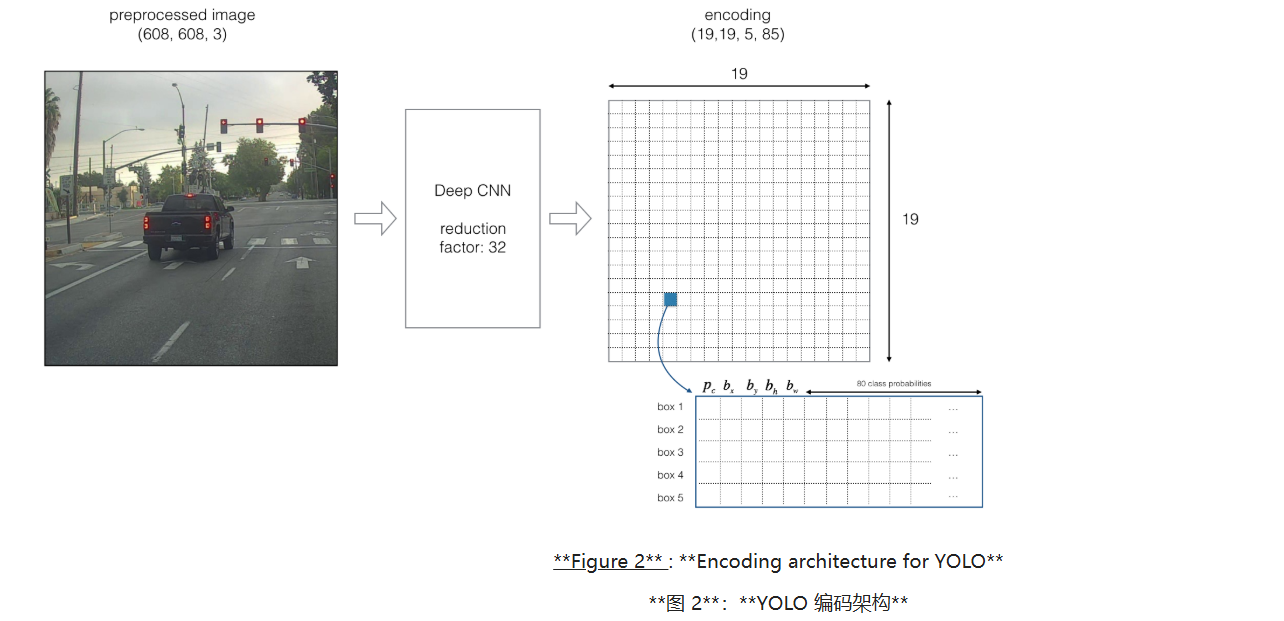 使用多个锚框允许我们可以在一个网格中识别到多个对象,每一个锚框对应一个置信度。如何定义,就是通过修改模型进行深度卷积之后的输出进行编码,使每一个网格中存在5个锚框的信息,具体如下图所示: