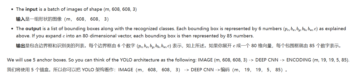 YOLO是一种流行算法,因为它能够实现高精度,同时还能实时运行。这种"只看一次"的算法在图像上"只看一次",这意味着只需要通过网络进行一次前向传播,就可以做出预测。在非最大抑制之后,它会输出识别的对象以及包围框。这里我们有80 个类,使用YOLO来进行目标检测,那么可以将类标签表示为 1 到 80 的整数,或者 80 维向量(80 个数字),其中第一个数字是 1,其余数字都是 0。视频教程使用了后一种表示方式;在本笔记本中,我们将使用两种表示方式,具体取决于哪一种对特定步骤来说更方便。