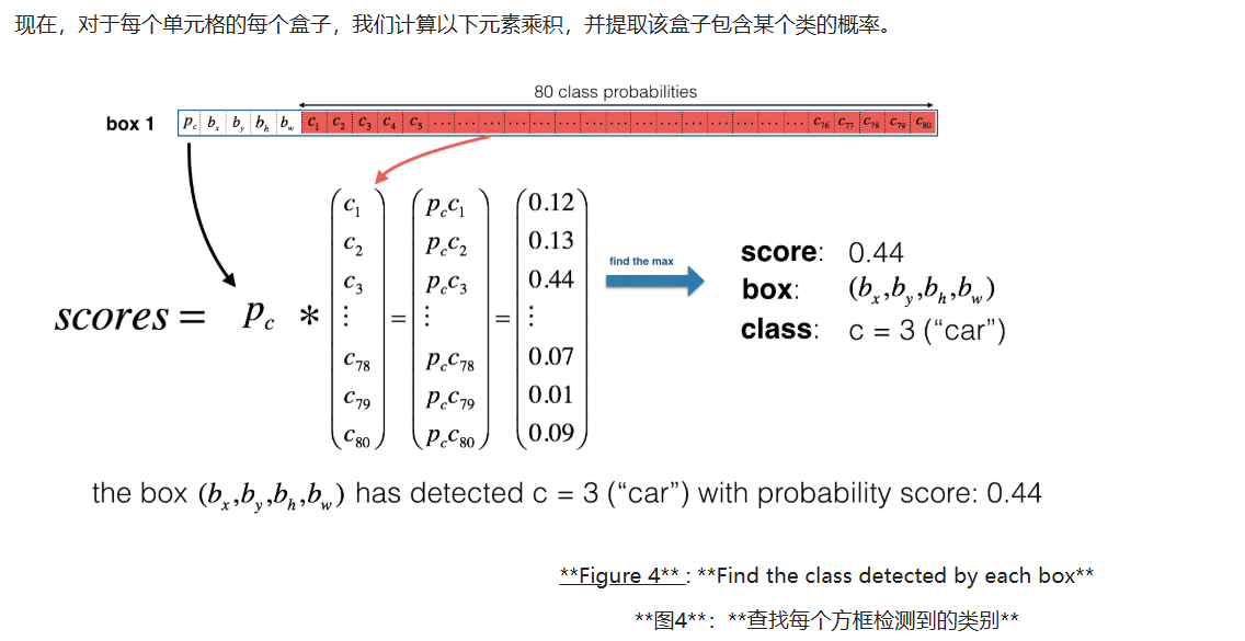 box_scores = box_confidence * box_class_probs # 计算每个候选框对每个类别的得分:物体置信度 * 类别条件概率