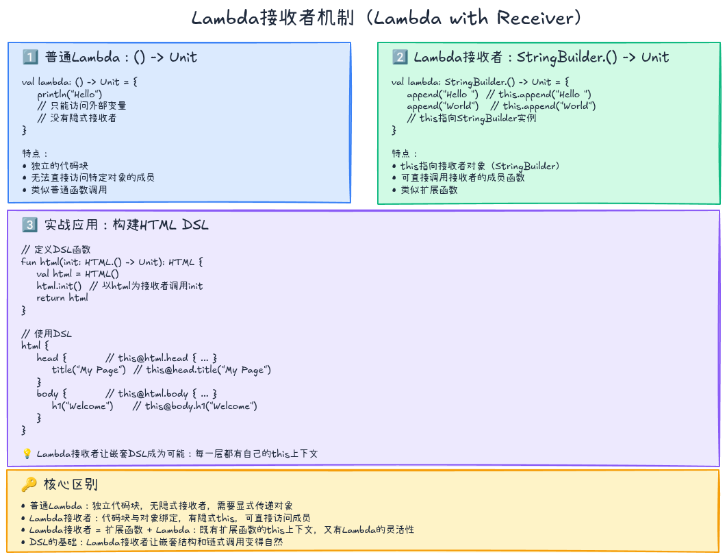 Lambda接收者是Kotlin DSL的核心特性,它允许在Lambda内部直接访问接收者对象的成员。