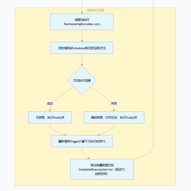 - 任务执行的本质是反射调用 @Scheduled 方法,执行完成后重新计算下次时间,直到应用停止