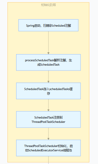 ThreadPoolTaskScheduler 会被初始化并启动,若未自定义调度器,Spring 会自动创建默认的 ThreadPoolTaskScheduler(核心线程数默认 1,可通过 spring.task.scheduling.pool.size 配置);调度器初始化时,会创建 ScheduledExecutorService(JDK 核心定时线程池),作为任务触发的底层线程池;
