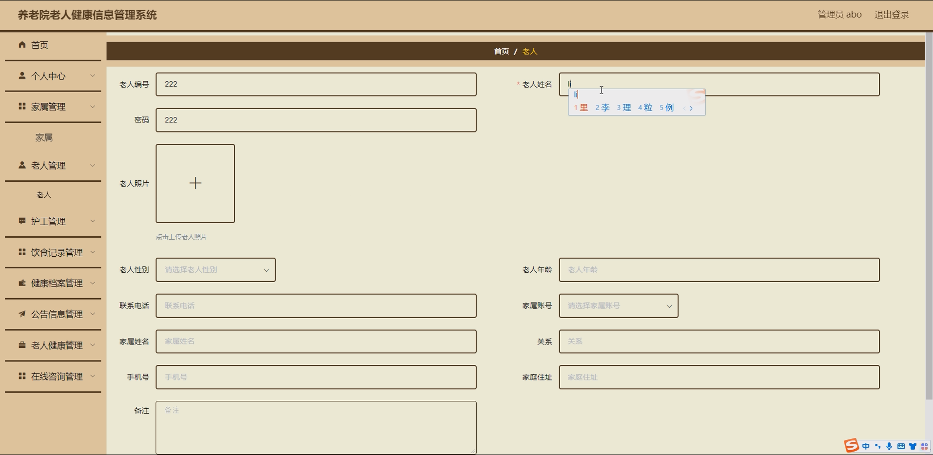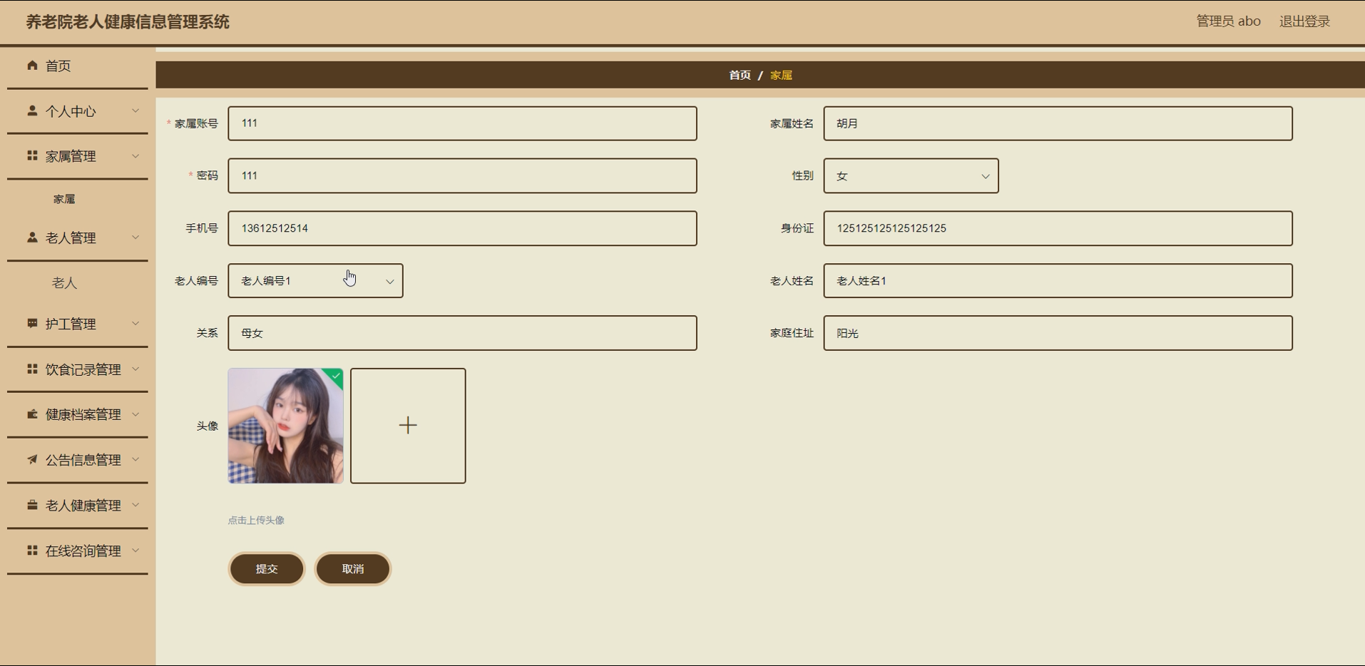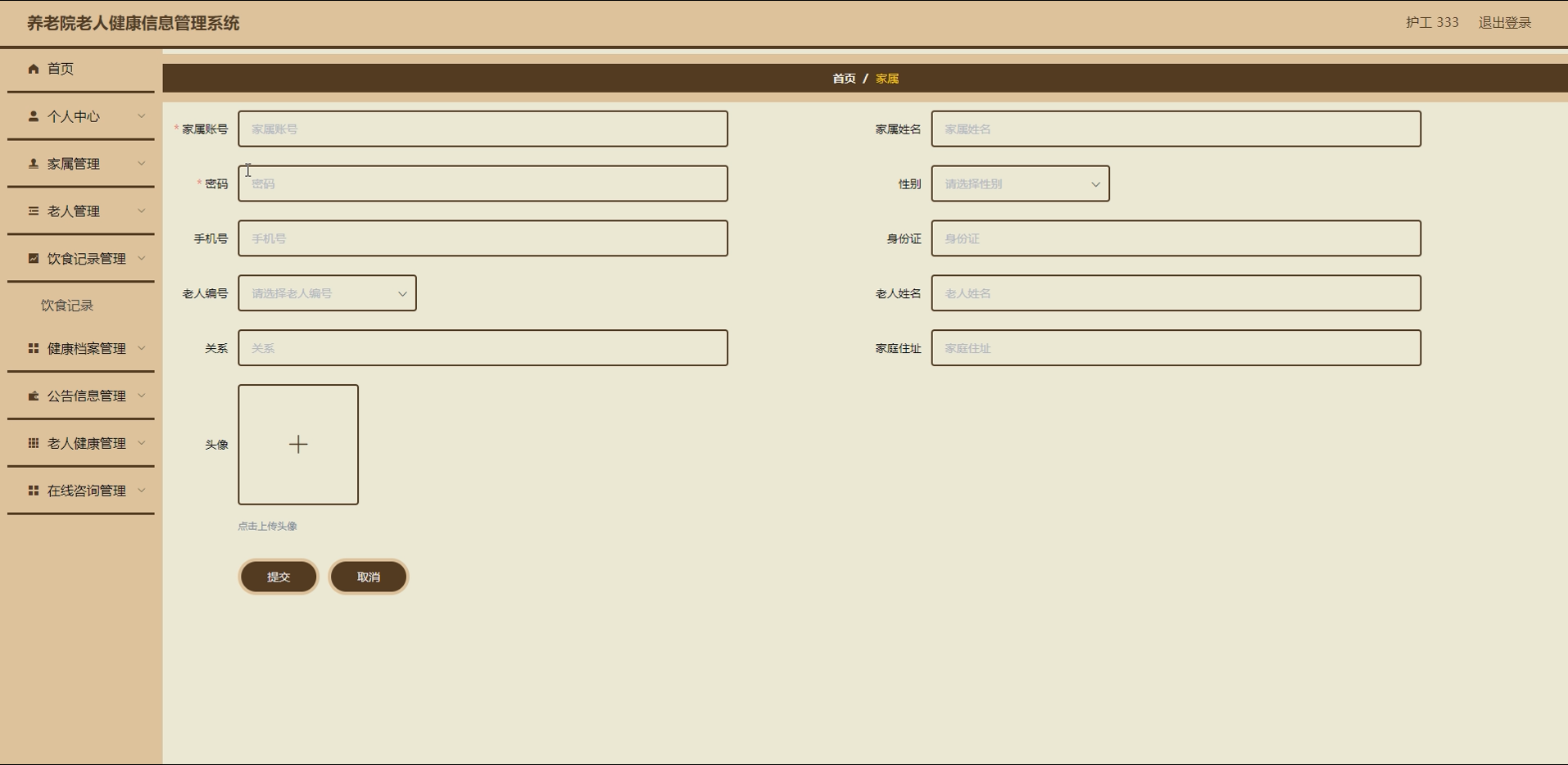 家属管理:管理员维护老人家属信息(姓名、联系方式、与老人关系等),家属可注册登录,修改个人信息,查看关联老人的健康、饮食信息,参与在线咨询。