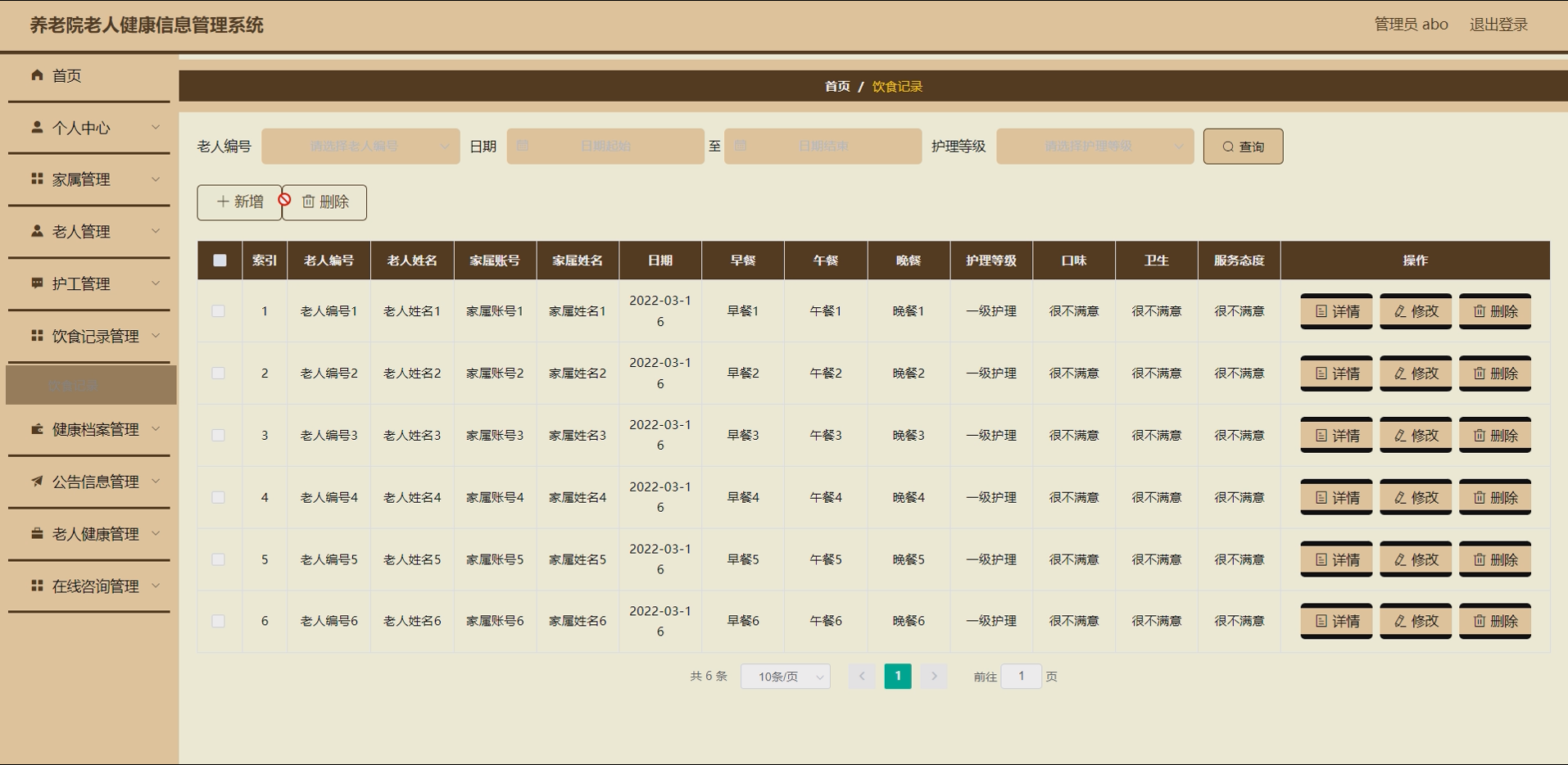 饮食记录:护工记录老人每日饮食情况(餐食种类、摄入量、饮食禁忌等),管理员与家属可查看饮食记录,结合健康状况调整饮食方案,实现饮食与健康联动。