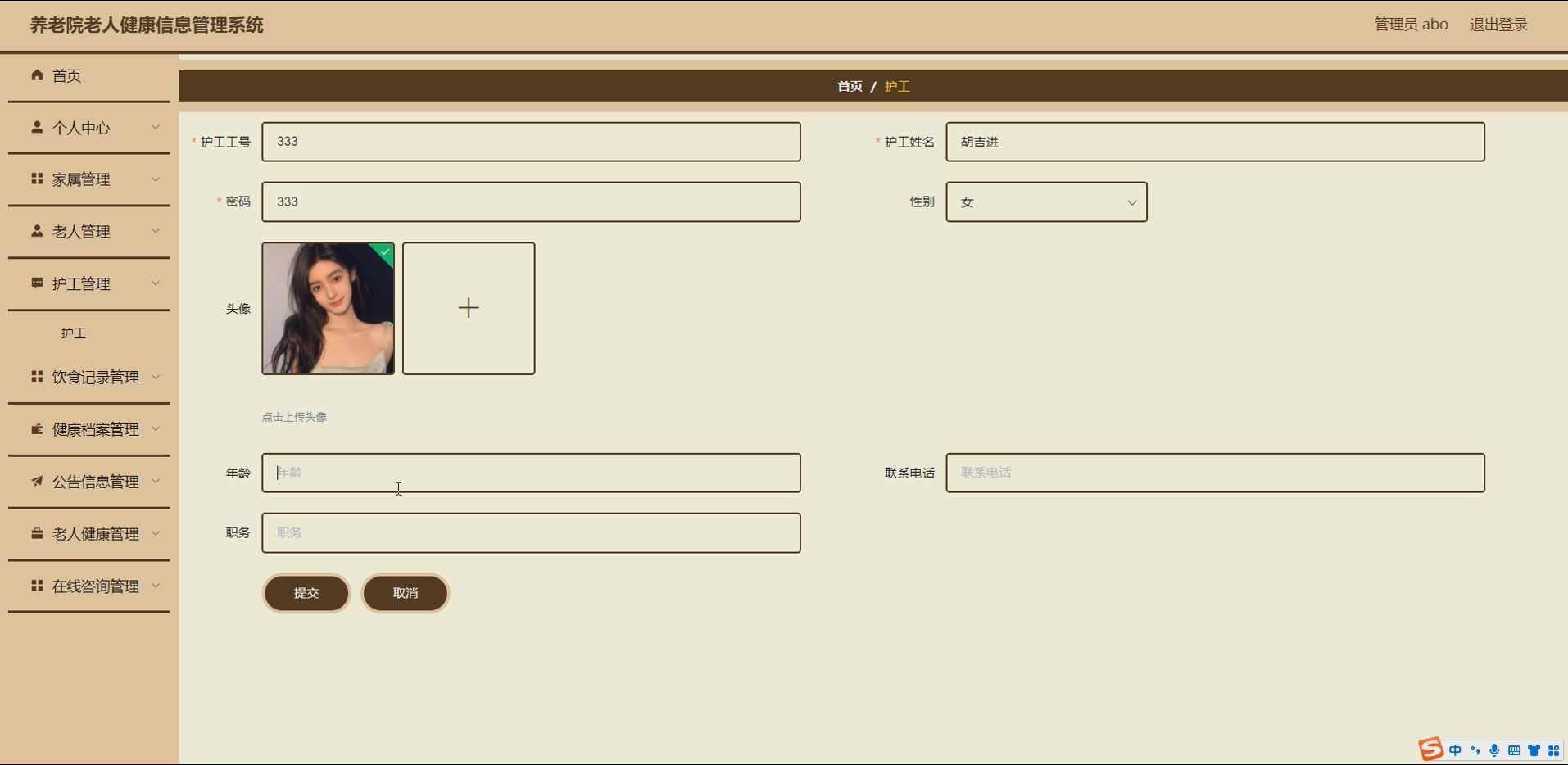 护工管理:管理员维护护工基本信息(姓名、联系方式、资质、负责老人范围等),支持信息查询、编辑、删除;护工可登录系统,管理自身负责老人的相关信息与服务记录。
