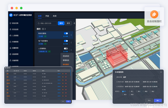 支持在地图上绘制矩形、多边形的电子围栏,自定义设置围栏规则,如围栏的名称、有效时间,可设置多种报警方式,包括越界报警、超员报警、串岗报警、离岗报警等;定位标签带有一键呼救按键,遇到紧急事件时,工作人员通过定位标签发出求助信号,系统智能显示该人员的具体位置和对应的监控视频,管理人员可以快速定位,及时了解现场情况,并采取准确的响应措施,及时到达事发现场救援。