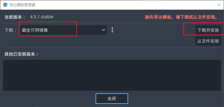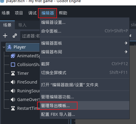 - 接下来我们去操作导出游戏吧,导出游戏是需要下载导出模版的,因为godot编辑器本体是很轻量化的自己不自带的,需要我们后续按需下载,我们来到左上角的编辑器点击管理导出模版