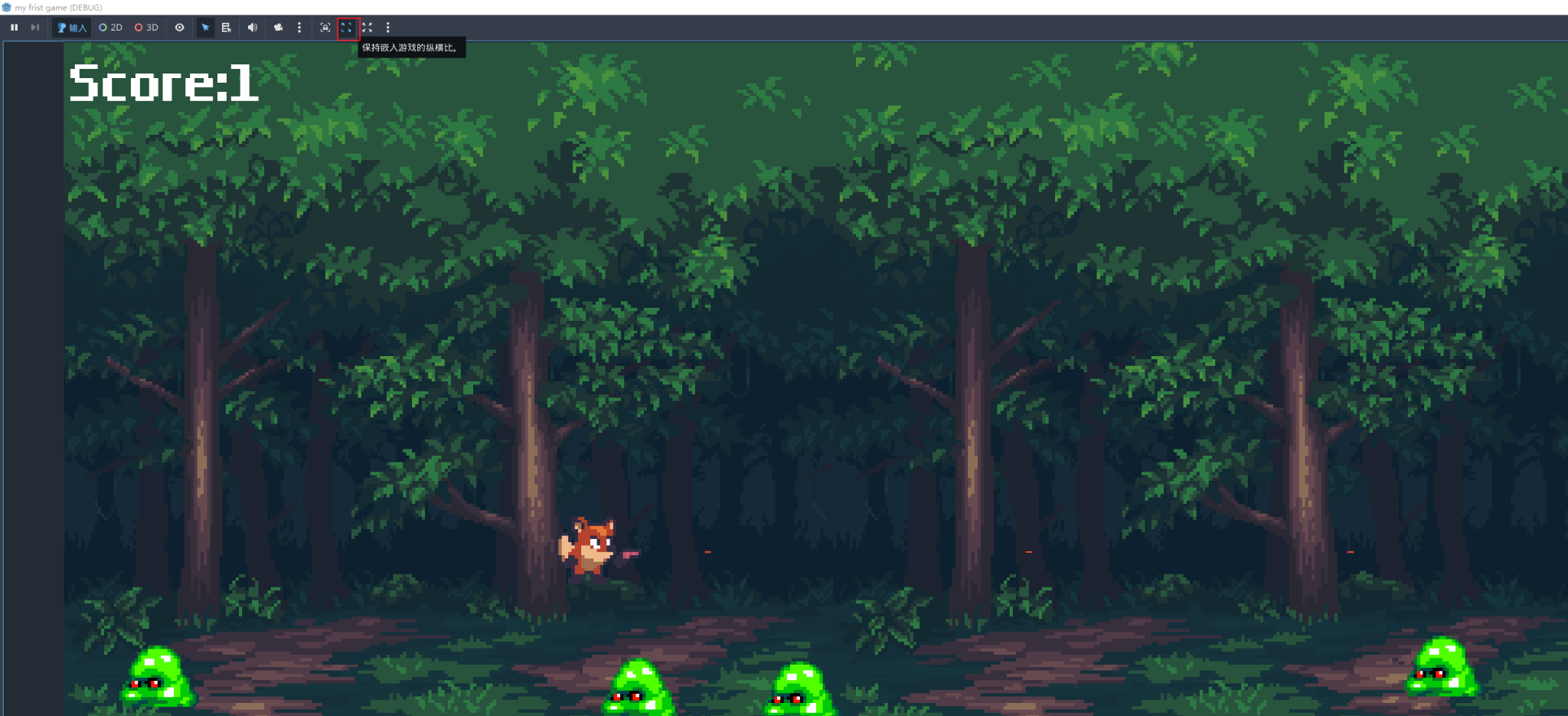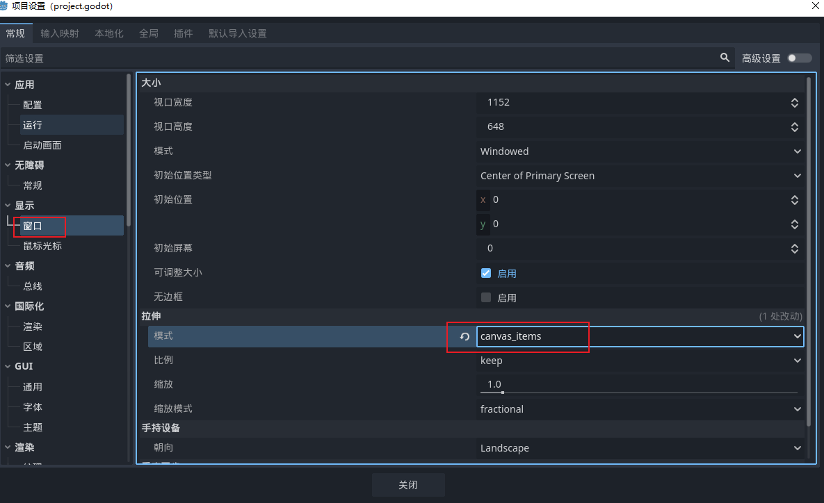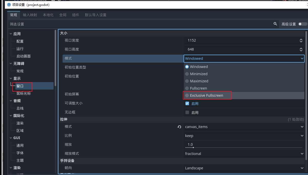 Canvas Item,并启用保持纵横比,保证不同分辨率下画面不变形。同时将窗口模式设置为 Exclusive Fullscreen,使游戏启动时自动进入全屏。 -