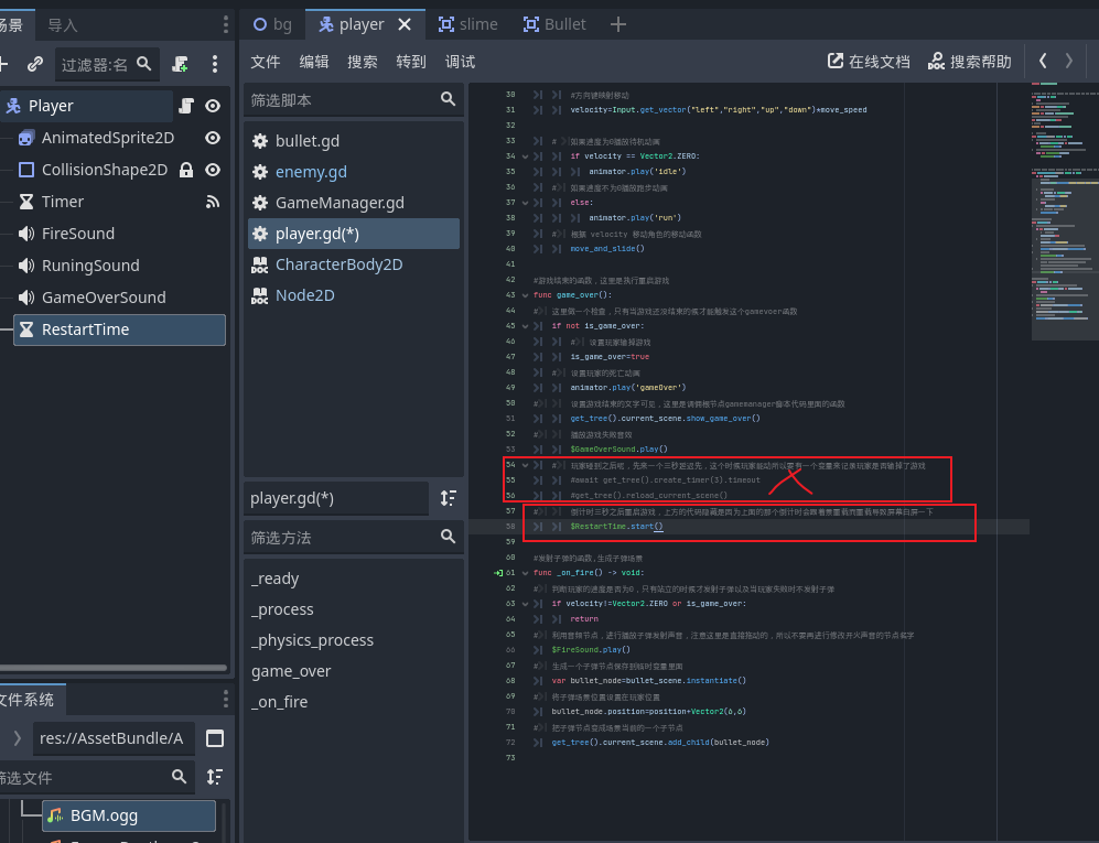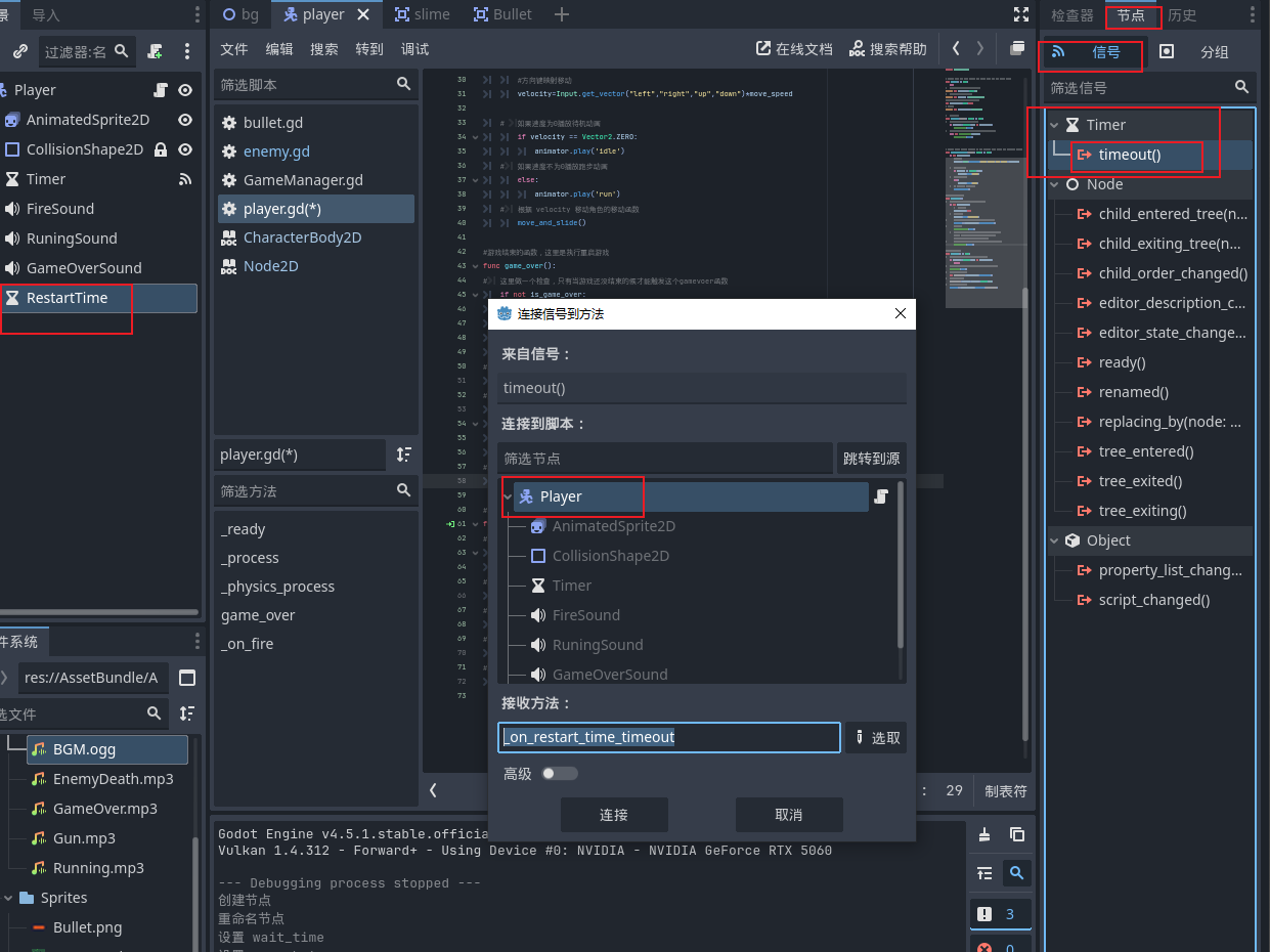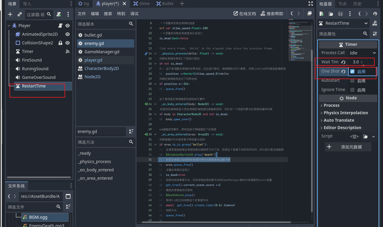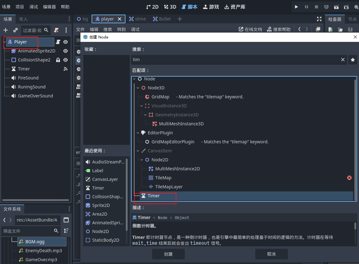 - 所以到我们的玩家场景中添加一个timer倒计时节点,并且重命名为RestartTime