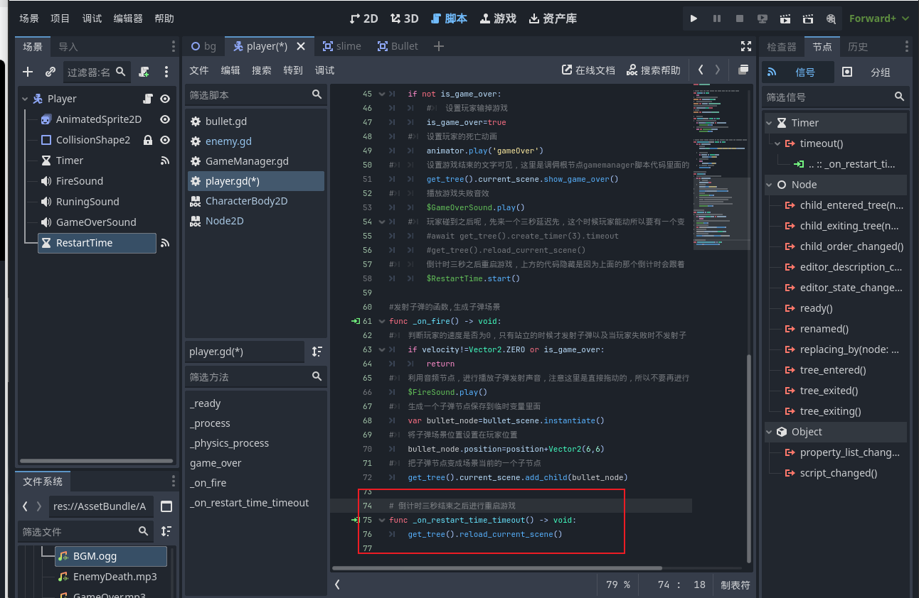 - 然后给这个信号事件写上重启游戏的代码