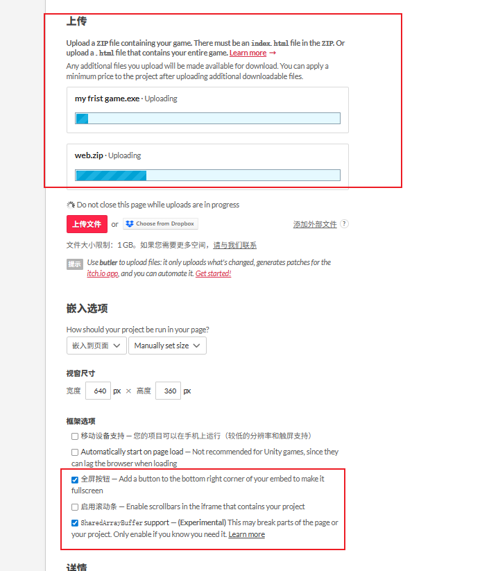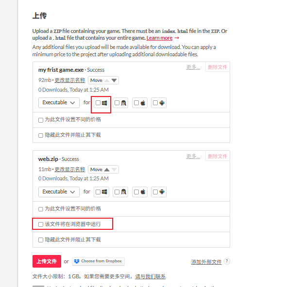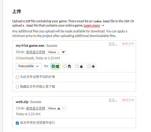 - 然后我们到创作中心去发布游戏,进行命名和上传游戏文件,web的就需要压缩一下成为zip,而windows的就直接可以点击上传exe文件就好,然后就是下方的2个需要进行勾选一下