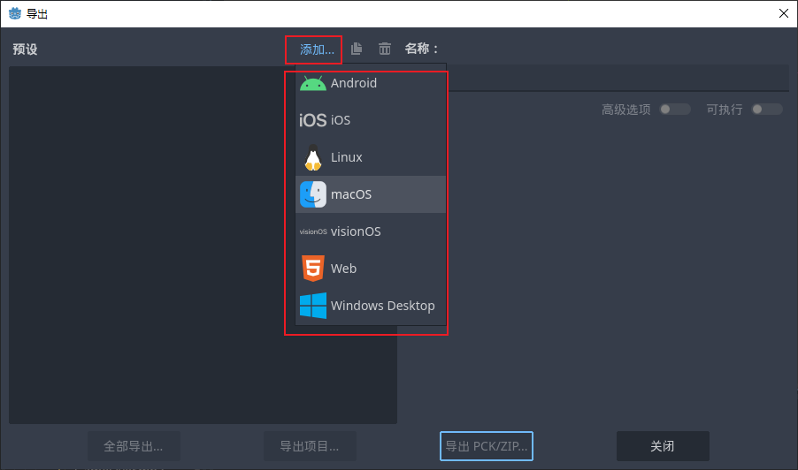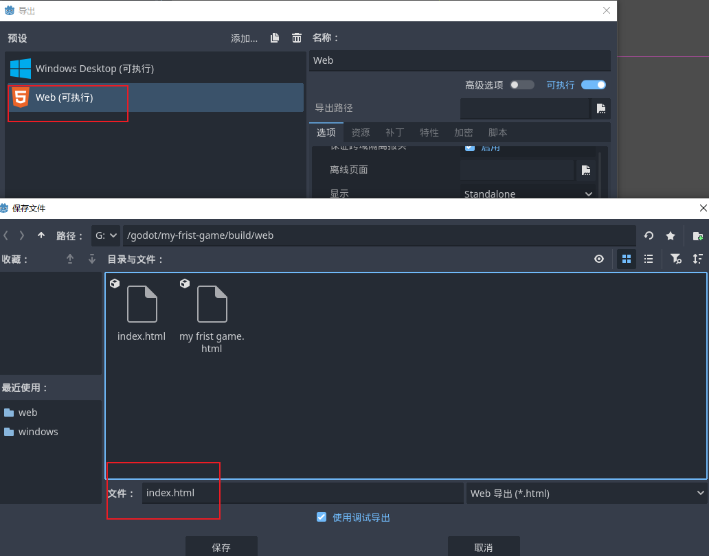接着完成游戏导出:下载并安装 Godot 导出模板后,在项目的导出设置中添加 Windows 预设,并启用