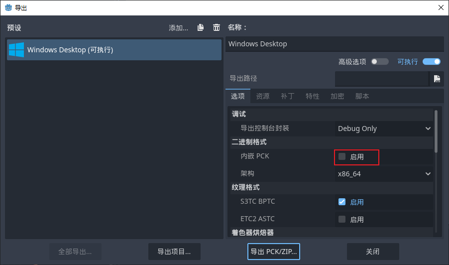 - 然后我们这里选择Windows的,并且启用一下这个pck,这样子我们导出来的文件就是一个单独的exe文件了