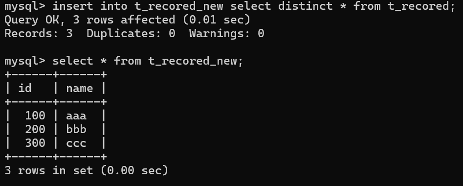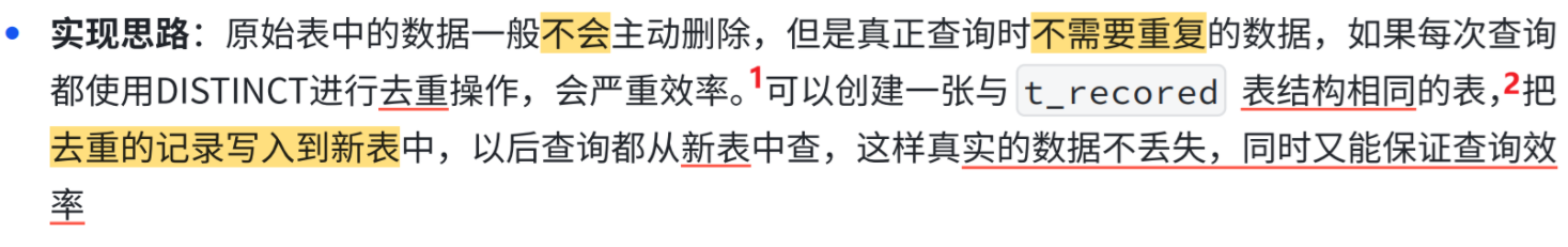 创建一张新表,表结构与t_recored相同; 新表中没有记录;原表中的记录**去重后写入到新表;**查询新表中的记录,实现去重。