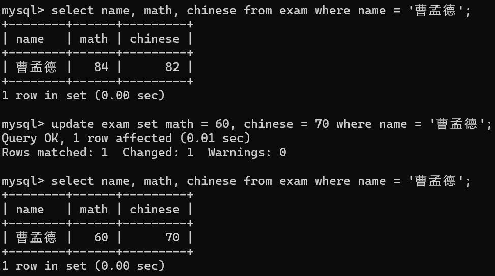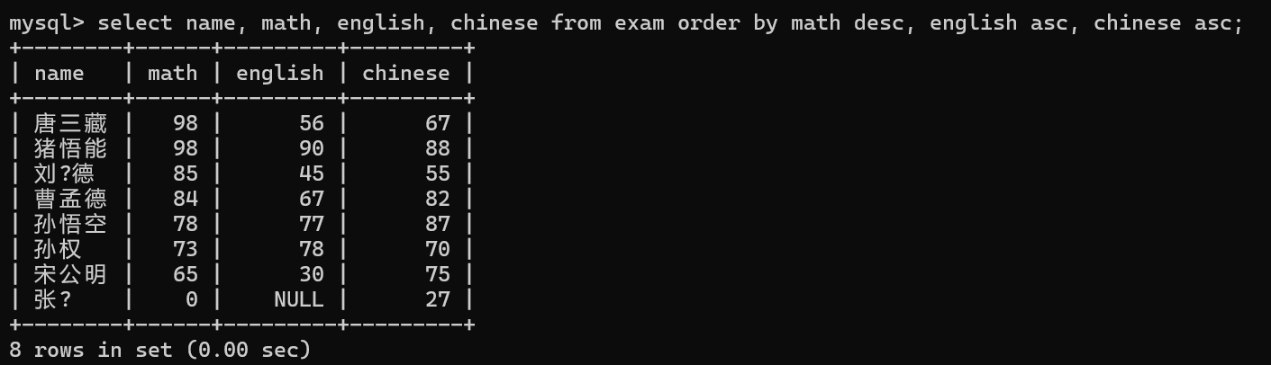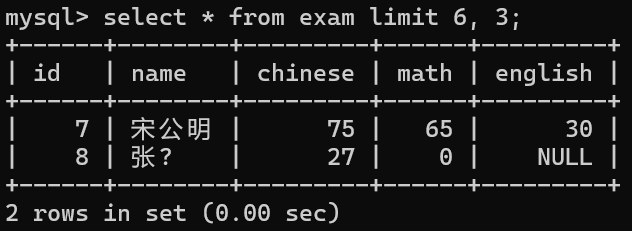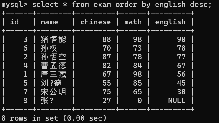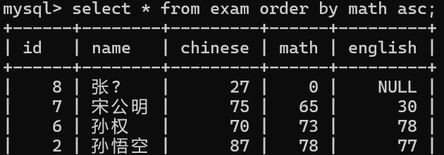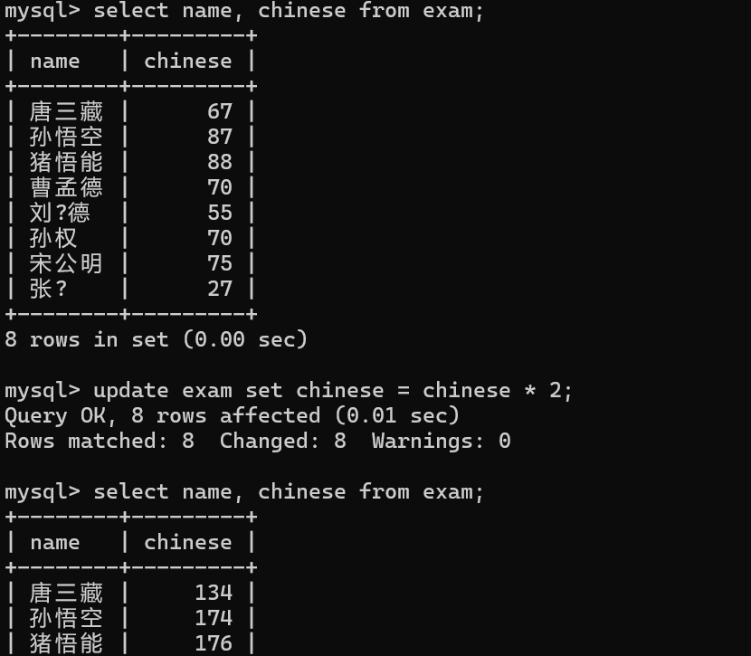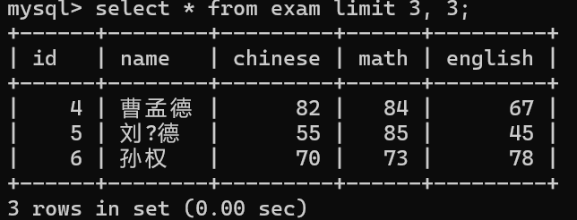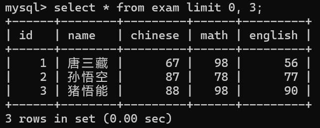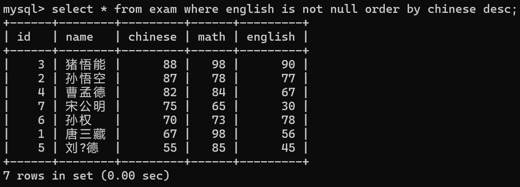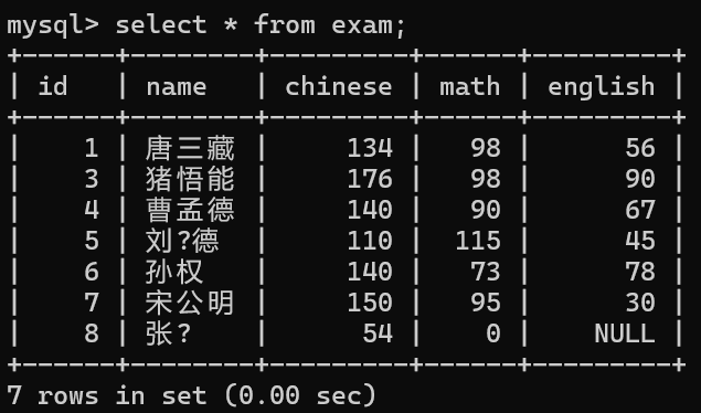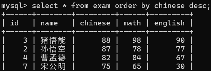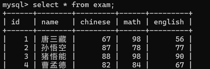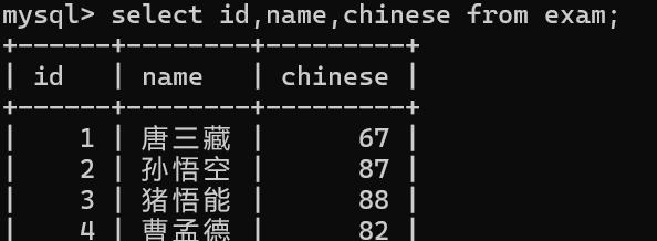 select id, name, chinese from exam;