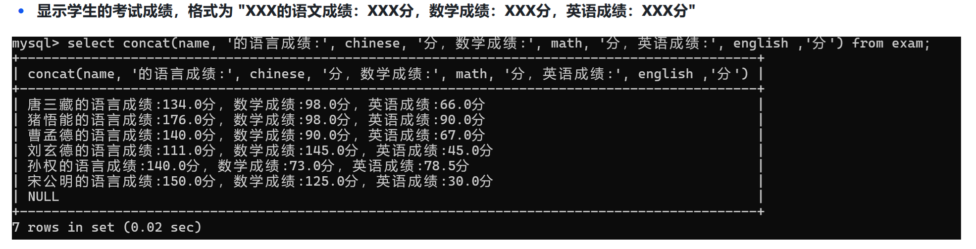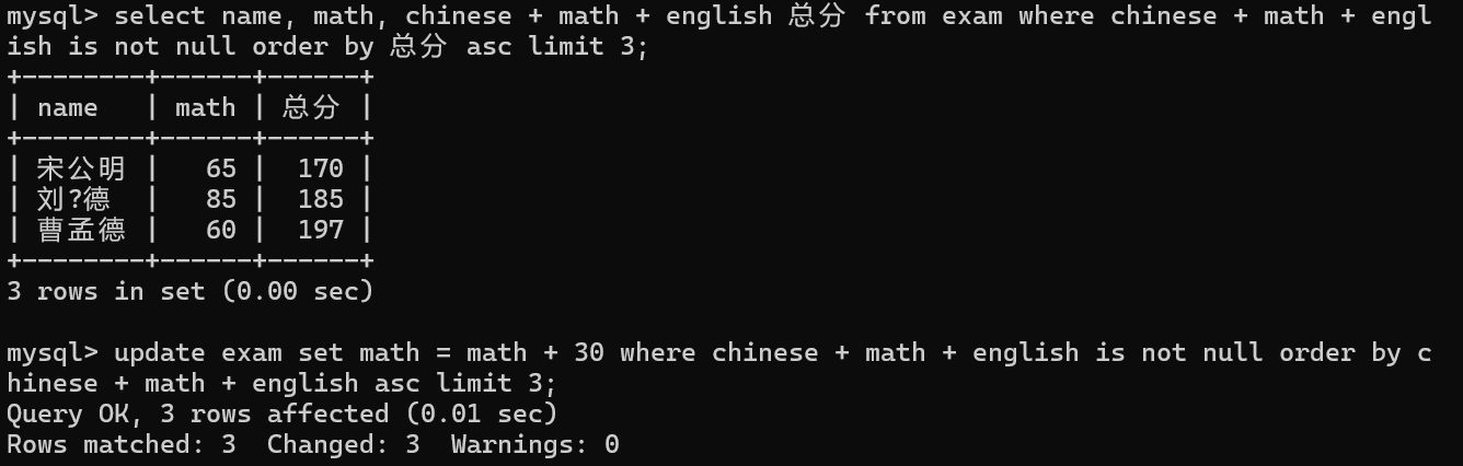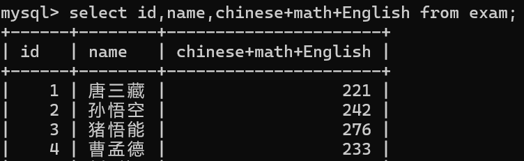 select id, name, chinese+math+English from exam;