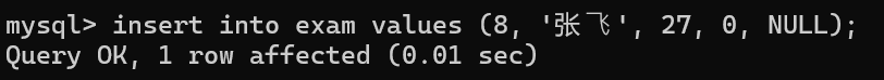insert into exam values (8, '张⻜', 27, 0, NULL);