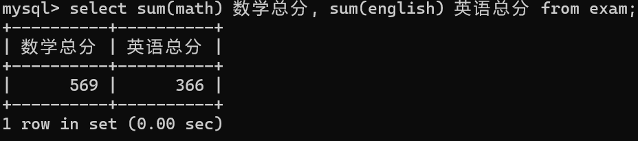 select sum(math) 数学总分, sum(english) 英语总分 from exam;