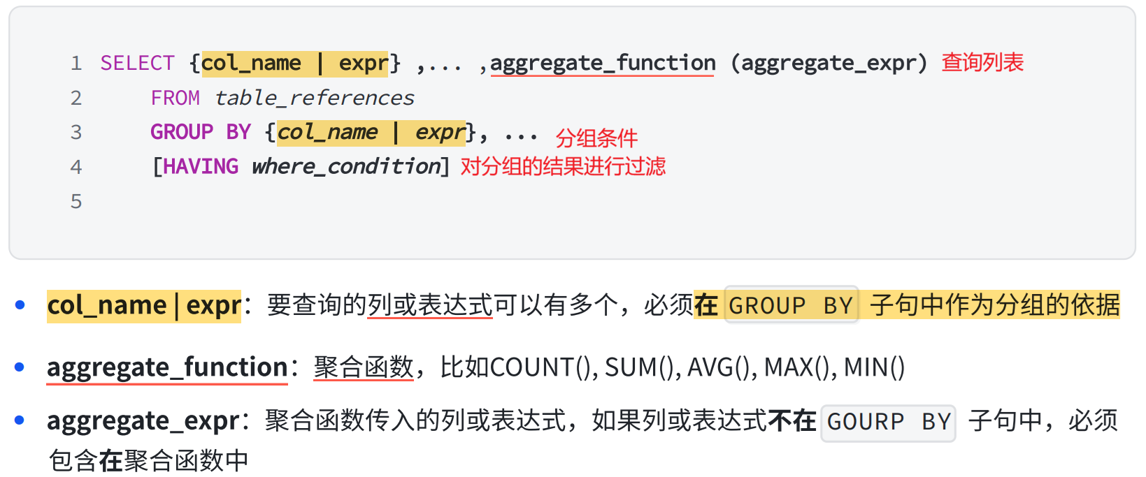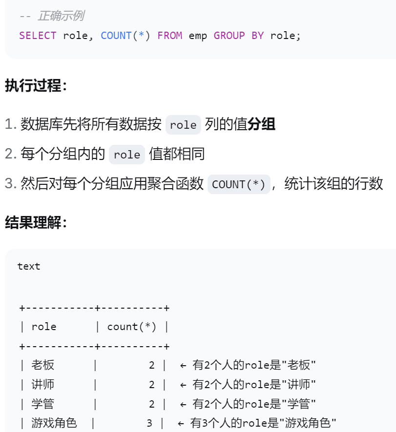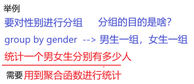GROUP BY 子句的作用是通过一定的规则 将一个数据集划分成若干个小的分组 ,然后针对 若干个 分组进行数据处理,比如使用聚合函数对分组进行统计。