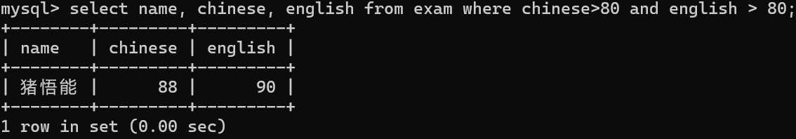 条件--chinese>80 and english>80;查询列--name, chinese, english