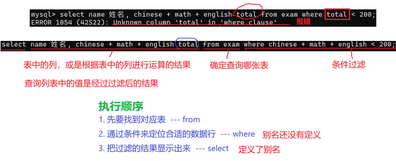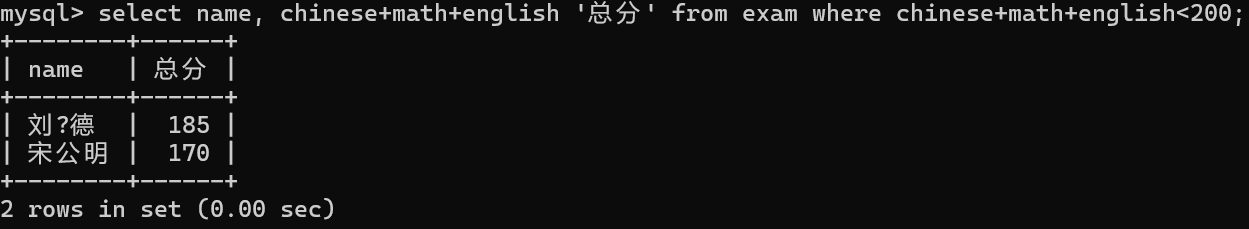 条件--chinese+math+english<200;查询列--name, chinese+math+english 总分