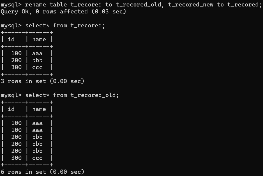 新表与原表重命名 ;查询重命名后 表中的记录,实现需求且原来中的记录不受影响。