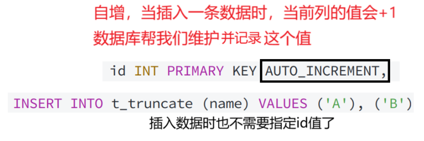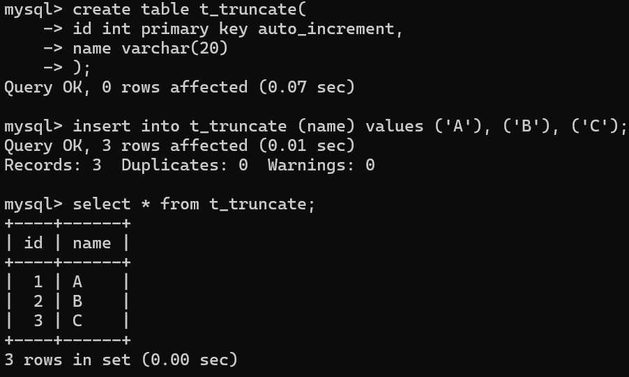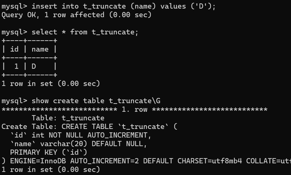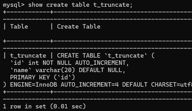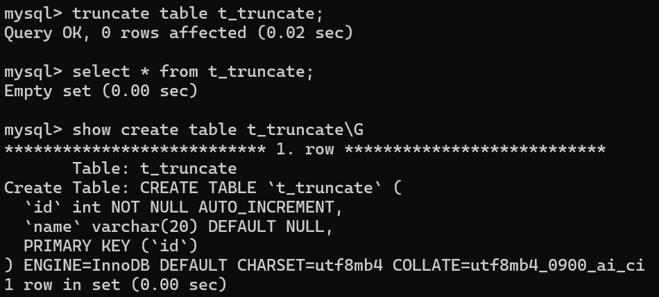 截断表,注意受影响的行数是0;查看表中的数据;查看表结构;AUTO_INCREMENT已被重置为0